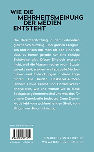 In ihrem ersten gemeinsamen Buch analysieren die Bestseller-Autoren Richard David Precht und Harald Welzer die Mechanismen, die in diese Sackgasse führen: Wie kann eine liberale Demokratie mit pluraler Medienlandschaft sich selbst so gefährden? Wie ist es in Deutschland, dem Land einer lange vorbildlichen Qualitätspresse und eines im internationalen Vergleich ebenso vorbildlichen öffentlich-rechtlichen Rundfunks dazu gekommen? Wie konnte und kann die Medienlandschaft durch die »vierte Gewalt« selbst unfreier werden? Und was bildet das veröffentlichte Meinungsbild ab, wenn es mit dem öffentlichen so wenig übereinstimmt?