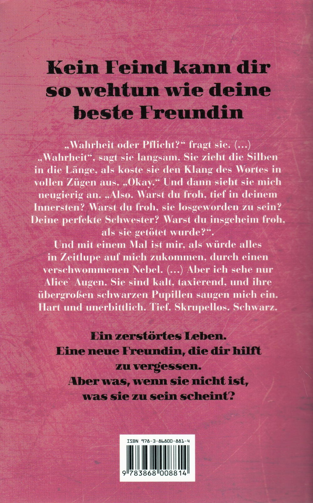 „Wahrheit oder Pflicht? " fragt sie. (...) „Wahrheit", sagt sie langsam. Sie zieht die Silben in die Länge, als koste sie den Klang des Wortes in vollen Zügen aus.. „Okay. " Und dann sieht sie mich neugierig an., Also. Warst du froh, tief in deinem Innersten? Warst du froh, sie losgeworden zu sein? Deine perfekte Schwester? Warst du insgeheim froh, als sie getötet wurde? ". Und mit einem Mal ist mir, als würde alles in Zeitlupe auf mich zukommen, durch einen verschwommenen Nebel. (..) Aber ich sehe nur Alice Augen. Sie sind kalt, taxierend, und ihre übergrossen schwarzen Pupillen saugen mich ein. Hart und unerbittlich. Tief. Skrupellos. Schwarz.