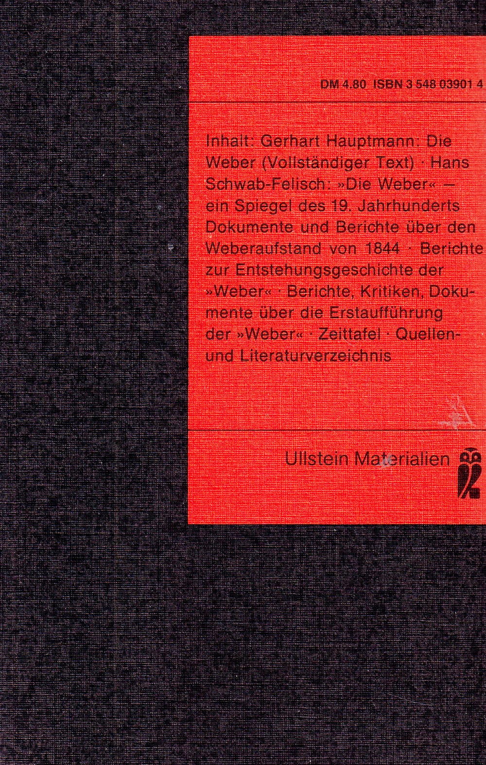 Inhalt: Gerhart Hauptmann: Die Weber (Vollständiger Text) Hans Schwab-Felisch: »Die Weber« ein Spiegel des 19. Jahrhunderts Dokumente und Berichte über den Weberaufstand von 1844 Berichte zur Entstehungsgeschichte der »Weber« Berichte, Kritiken, Dokumente über die Erstaufführung der »Weber« Zeittafel Quellenund Literaturverzeichnis