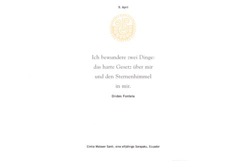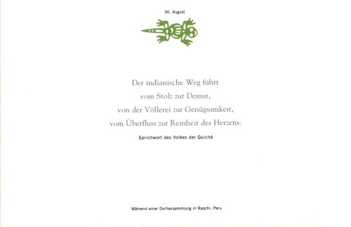 Danielle und Olivier Föllmi bringen uns in ihrer Reihe Weisheit der Menschheit das spirituelle Gedankengut Lateinamerikas nahe. Auf ihrer Reise von der mexikanischen Wüste bis zur Südspitze Chiles erlebten sie zahlreiche Feste, Rituale und alte Traditionen der indianischen Ureinwohner. Olivier Föllmi hielt seine Eindrücke auf farbenprächtigen Fotografien fest. Danielle Föllmi sammelte Texte aus der reichen Literatur dieses Erdteils. Dazu gehören traditionelle indianische Weisheiten ebenso wie Zitate lateinamerikanischer Schriftsteller.