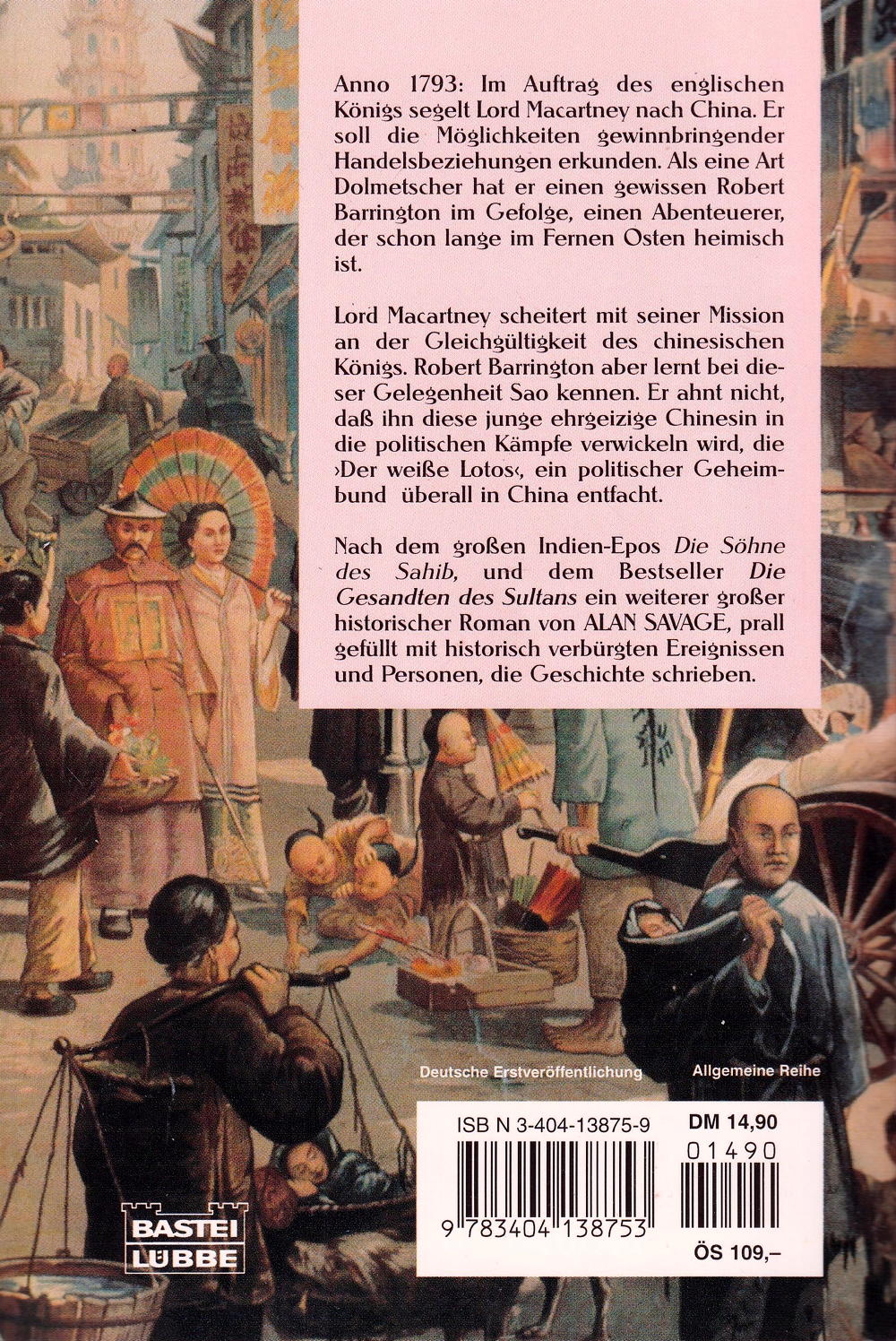 Anno 1793: Im Auftrag des englischen Königs segelt Lord Macartney nach China. Er soll die Möglichkeiten gewinnbringender Handelsbeziehungen erkunden. Als eine Art Dolmetscher hat er einen gewissen Robert Barrington im Gefolge, einen Abenteuerer, der schon lange im Fernen Osten heimisch ist. Lord Macartney scheitert mit seiner Mission an der Gleichgültigkeit des chinesischen Königs. Robert Barrington aber lernt bei dieser Gelegenheit Sao kennen. Er ahnt nicht, dass ihn diese junge ehrgeizige Chinesin in die politischen Kämpfe verwickeln wird, die Der weisse Lotoss, ein politischer Geheimbund überall in China entfacht. Nach dem grossen Indien-Epos Die Söhne des Sahib, und dem Bestseller Die Gesandten des Sultans ein weiterer grosser historischer Roman von ALAN SAVAGE, prall gefüllt mit historisch verbürgten Ereignissen und Personen, die Geschichte schrieben.
