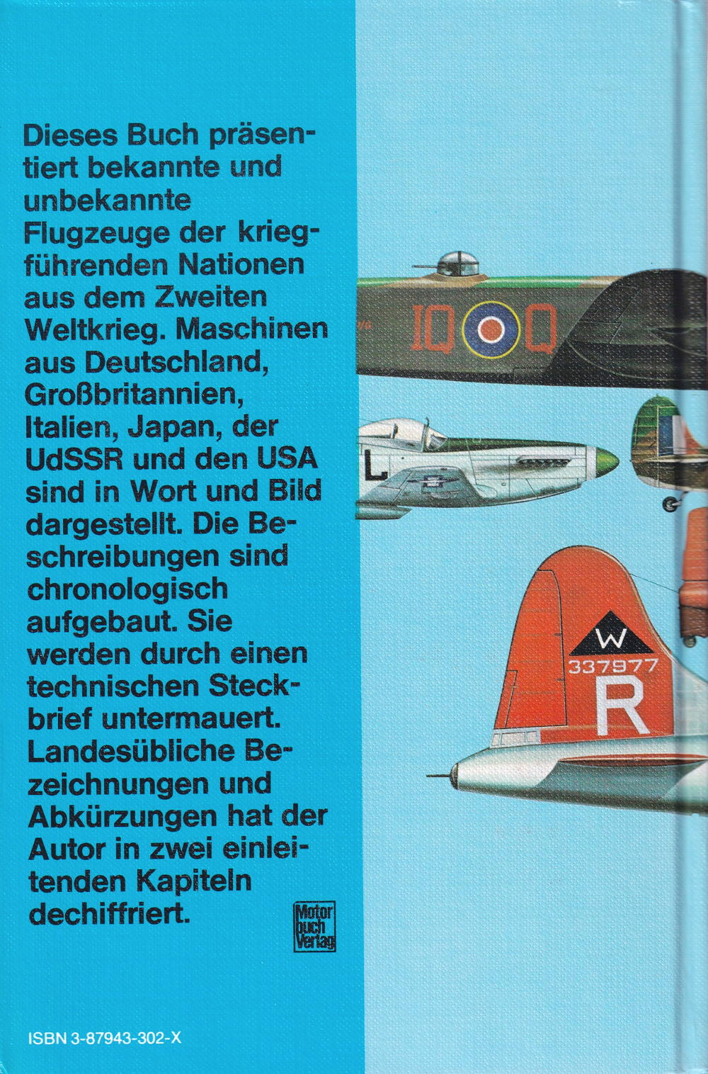 Dieses Buch präsentiert bekannte und unbekannte Flugzeuge de kriegführenden Nationen aus dem Zweiten Weltkrieg. Die Maschinen aus Deutschland, Grossbritannien, Italien, Japan, der UdSSR und den USA sind in Wort und Bild dargestellt. Die Beschreibungen sind chronologisch aufgebaut. Sie werden durch eien technischen Steckbrief untermauert. Landesübliche Bezeichnungen und Abkürzungen hat der Autor in zwei einleitenden Kapiteln dechiffriert.