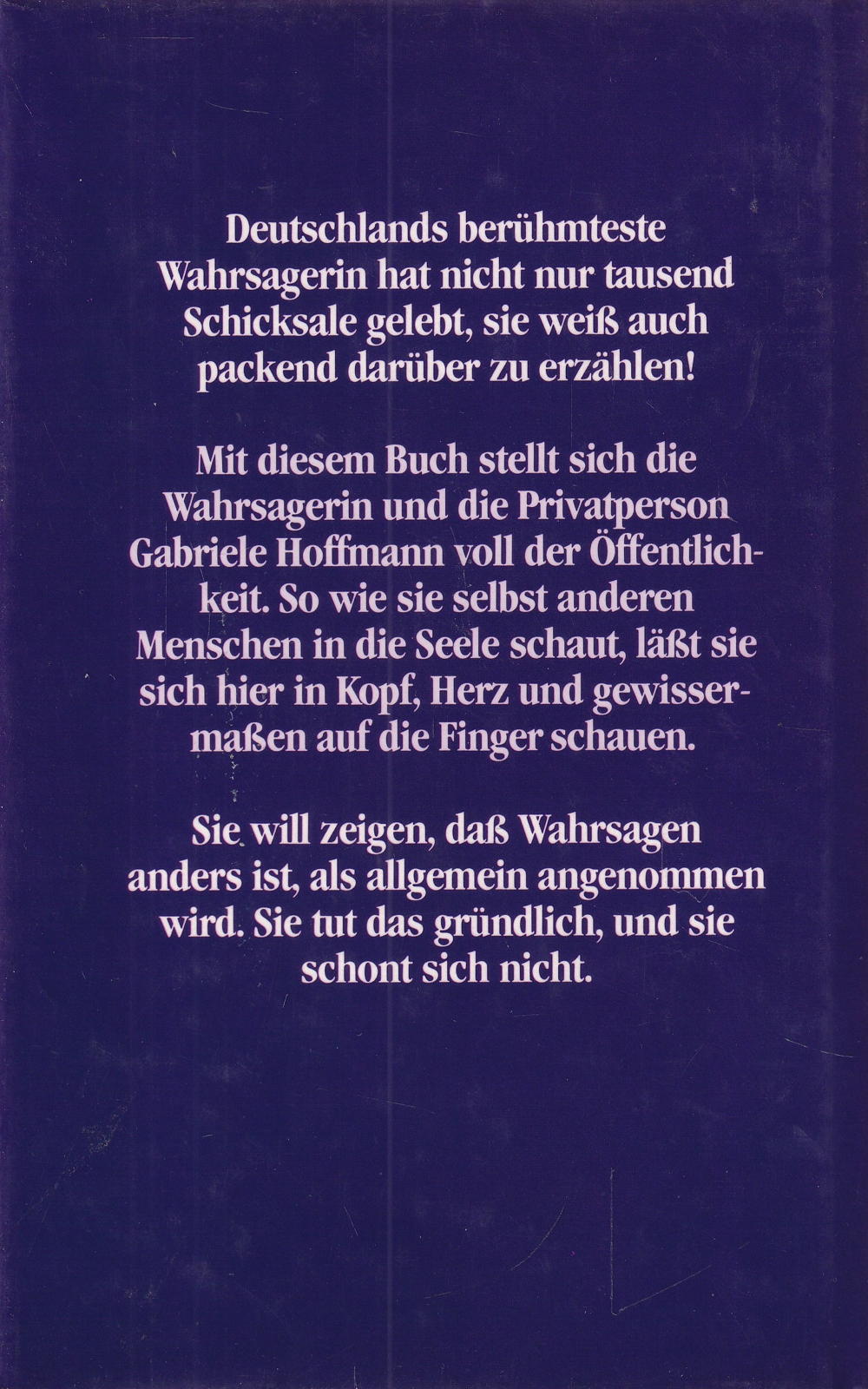 Mit diesem Buch stellt sich die Wahrsagerin und die Privatperson Gabriele Hoffmann voll der Öffentlichkeit. So wie sie selbst anderen Menschen in die Seele schaut, lässt sie sich hier in Kopf, Herz und gewissermassen auf die Finger schauen.