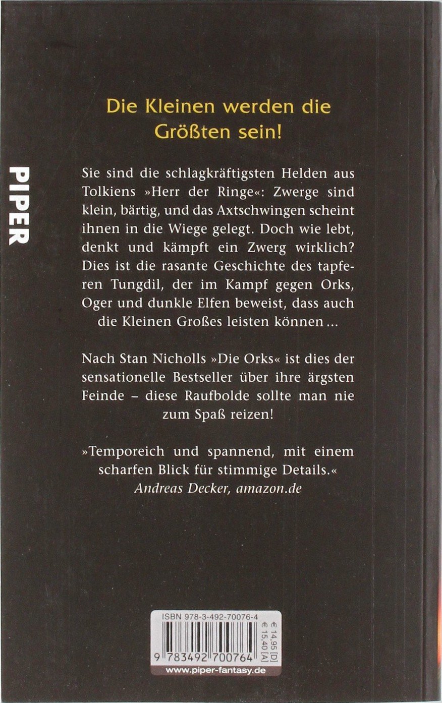 Sie sind die schlagkräftigsten Helden aus J. R. R. Tolkiens "Herr der Ringe": Zwerge sind klein, bärtig, und das Axtschwingen scheint ihnen in die Wiege gelegt. Doch wie lebt, denkt und kämpft ein Zwerg wirklich? Dies ist die rasante Geschichte des tapferen Tungdil, der im Kampf gegen Orks, Oger und dunkle Elfen beweist, dass auch die Kleinen Grosses leisten können ... Nach Stan Nicholls "Die Orks" ist dies der sensationelle Bestseller über ihre ärgsten Feinde - diese Raufbolde sollte man nie zum Spass reizen!