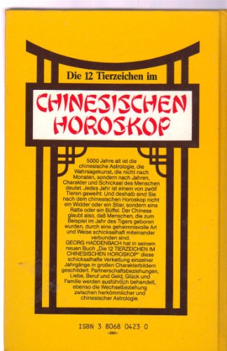GEORG HADDENBACH hat in seinem neuen Buch „Die 12 TIERZEICHEN IM CHINESISCHEN HOROSKOP" diese schicksalhafte Verkettung einzelner Jahrgänge in grossen Charakterbildern geschildert. Partnerschaftsbeziehungen, Liebe, Beruf und Geld, Glück und Familie werden ausführlich behandelt, ebenso die Wechselbeziehung zwischen herkömmlicher und chinesischer Astrologie.
