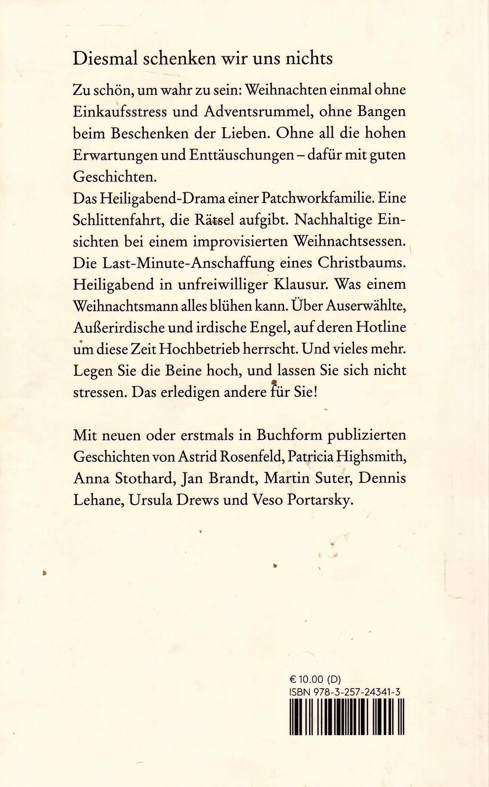 Zu schön, um wahr zu sein: Weihnachten einmal ohne Einkaufsstress und Adventsrummel, ohne Bangen beim Beschenken der Lieben. Ohne all die hohen Erwartungen und Enttäuschungen. Mit neuen unveröffentlichten Geschichten von Astrid Rosenfeld, Jan Brandt, Patricia Highsmith, Martin Suter, Dennis Lehane, Anna Stothard u. a. Das Heiligabend-Drama einer Patchworkfamilie. Die Geschichte von der Heiligen Familie, verblüffend neu erzählt. Nachhaltige Einsichten bei einem improvisierten Weihnachtsessen. Heiligabend in unfreiwilliger Klausur. Eine Schlittenfahrt, die Rätsel aufgibt. Was einem Weihnachtsmann alles blühen kann. Die Last-Minute-Anschaffung eines Christbaums. Und vieles mehr. Mit Beiträgen von Anton Cechov, Hans Fallada, Paulo Coelho, Zoran Drvenkar, Maria Elisabeth Straub, Hans Werner Kettenbach, Rolf Dobelli und weiteren.
