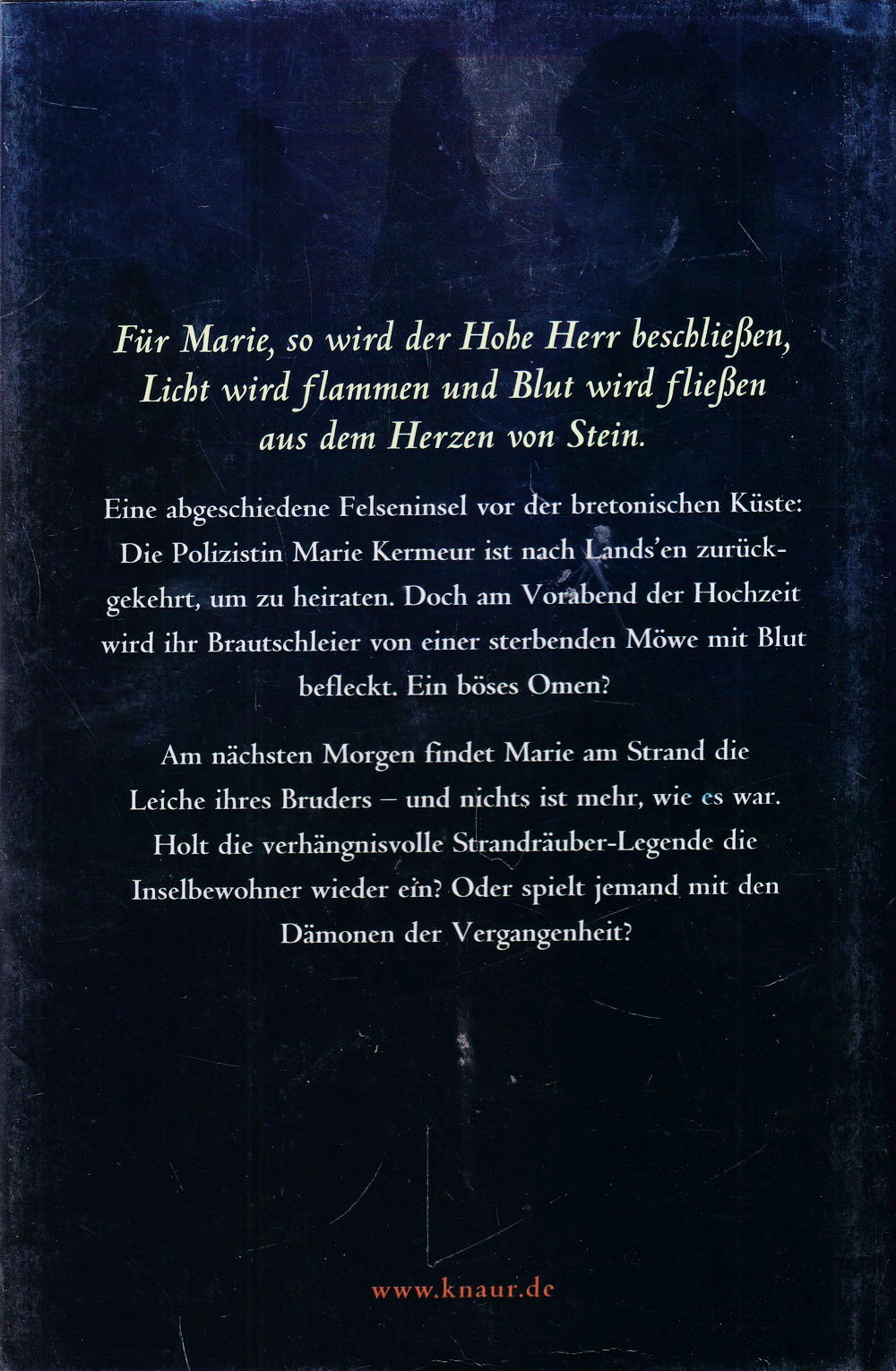 Die Steine bluten, wenn ein Unrecht auf der Insel geschieht Eine verhängnisvolle Legende überschattet das Leben der kleinen Gemeinschaft. Spielt jemand mit den Dämonen der Vergangenheit? Die Polizistin Marie Kermeur kehrt zurück auf ihre bretonische Heimatinsel, um ihrem Jugendfreund das Jawort zu geben. Am Hochzeitsmorgen passiert das Entsetzliche: Sie entdeckt bei einem Spaziergang am Strand die Leiche ihres Bruders. In seiner Hand findet Marie eine rätselhafte Botschaft in bretonischer Sprache. Als einer der Menhire aus dem mystischen Steinkreis zu bluten anfängt, ist Marie sich sicher: Es war kein Unfall! Aber hat all das wirklich mit einer jahrhundertealten Legende zu tun? Da geschieht auch schon ein weiterer Mord ... Marie beginnt zu ermitteln und erhält Unterstützung von Lucas Fersen, einem Spezialisten für rituelle Mordfälle. Auch wenn das Verhältnis der beiden erst angespannt ist, entwickeln sie bald leidenschaftliche Gefühle füreinander. Das Ermittlerduo kommt einem erschütternden Familiengeheimnis auf die Spur, und für Marie ist nichts mehr, wie es war ...