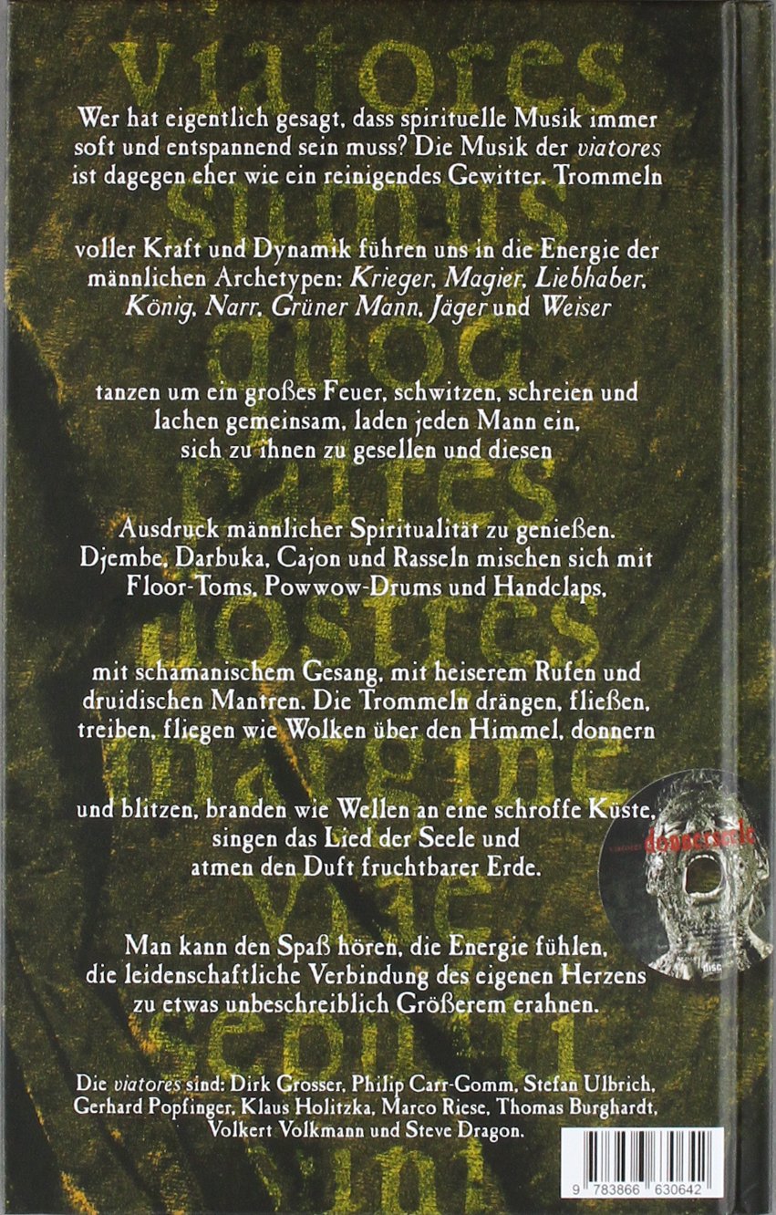 Wer hat eigentlich gesagt, dass spirituelle Musik immer soft und entspannend sein muss? Die Musik der Viatores - einem Projekt von Männern aus dem Umfeld des Arun Verlages - ist dagegen eher wie ein reinigendes Gewitter. Trommeln voller Kraft und Dynamik führen uns in den einzelnen Tracks in die Energie der männlichen Archetypen: Krieger, Magier, Liebhaber, König, Narr, Grüner Mann, Jäger, Sammler und Weiser tanzen um ein grosses Feuer, schwitzen, schreien und lachen gemeinsam, laden jeden Mann ein, sich zu ihnen zu gesellen und diesen Ausdruck männlicher Spiritualität zu geniessen.