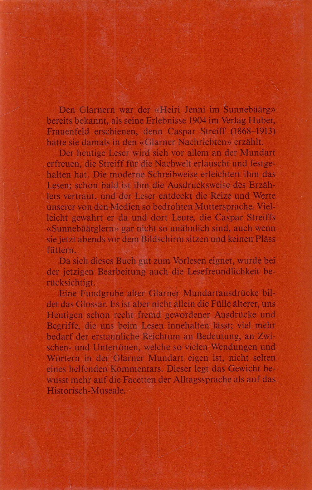 Eine Fundgrube alter Glarner Mundartausdrücke bildet das Glossar. Es ist aber nicht allein die Fülle älterer, uns Heutigen schon recht fremd gewordener Ausdrücke und Begriffe, die uns beim Lesen innehalten lässt; viel mehr bedarf der erstaunliche Reichtum an Bedeutung, an Zwischen- und Untertönen, welche so vielen Wendungen und Wörtern in der Glarner Mundart eigen ist, nicht selten eines helfenden Kommentars. Dieser legt das Gewicht bewusst mehr auf die Facetten der Alltagssprache als auf das.