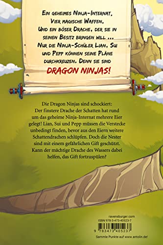 Die Dragon Ninjas sind schockiert: Der finstere Drache der Schatten hat rund um das geheime Ninja-Internat mehrere Eier gelegt! Lian, Sui und Pepp müssen die Verstecke unbedingt finden, bevor aus den Eiern weitere Schattendrachen schlüpfen. Doch die Nester sind mit einem gefährlichen Gift geschützt. Kann der mächtige Drache des Wassers dabei helfen, das Gift fortzuspülen?