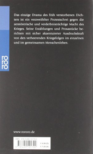 Das einzige Drama des früh verstorbenen Dichters ist ein verzweifelter Protestschrei gegen die zerstörerische und verderbnisträchtige Macht des Krieges. Seine Erzählungen und Prosastücke berichten mit sicher akzentuierter Ausdruckskraft von den verheerenden Kriegsfolgen im einzelnen und im gemeinsamen Menschenleben.