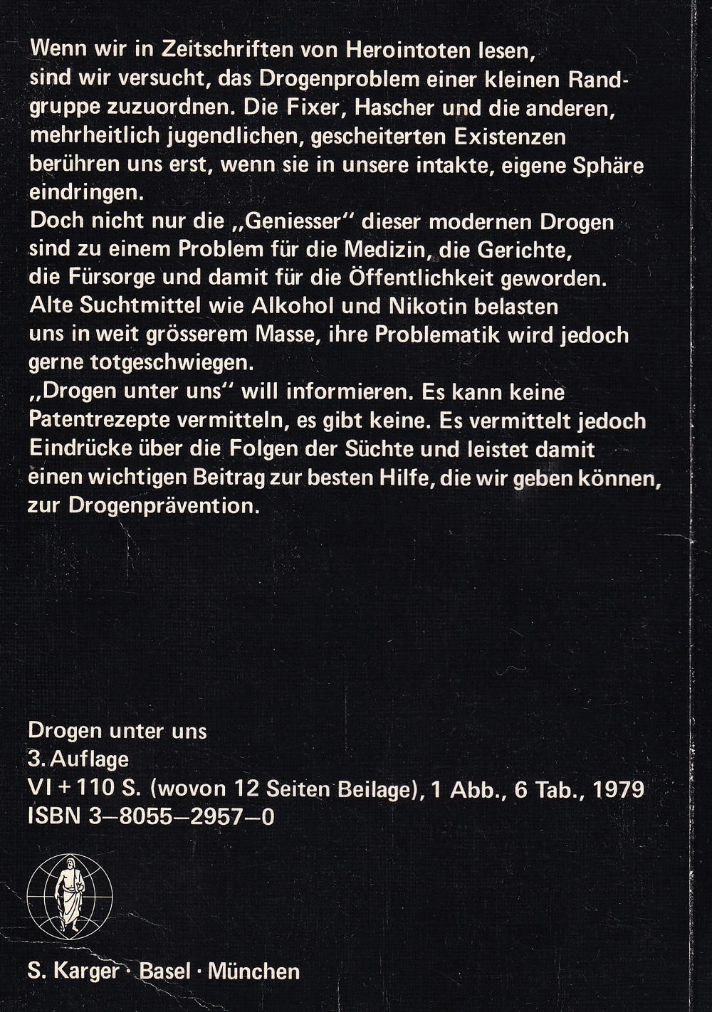 Doch nicht nur die,, Geniesser" dieser modernen Drogen sind zu einem Problem für die Medizin, die Gerichte, die Fürsorge und damit für die Öffentlichkeit geworden. Alte Suchtmittel wie Alkohol und Nikotin belasten uns in weit grösserem Masse, ihre Problematik wird jedoch gerne totgeschwiegen.
