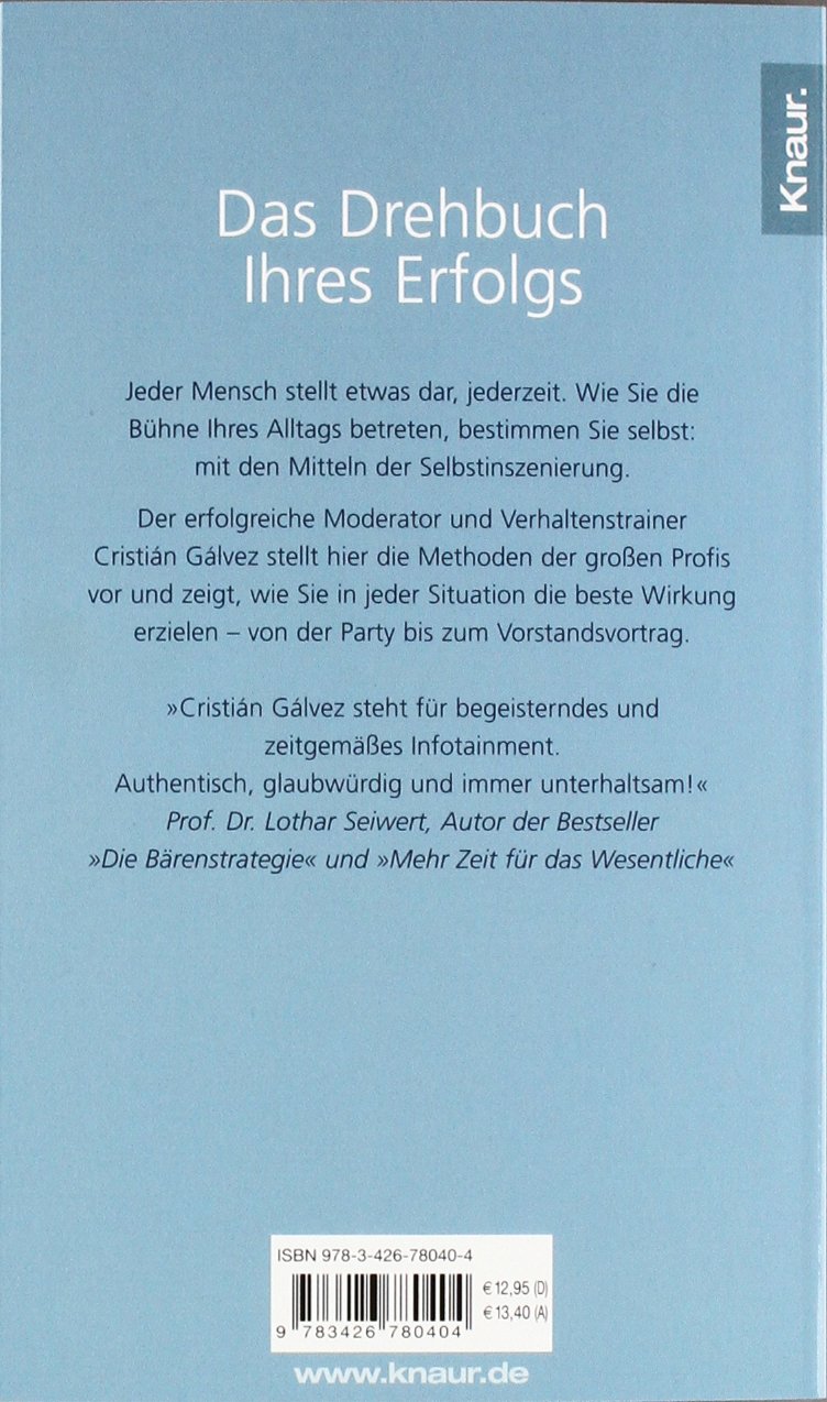 Jeder Mensch stellt etwas dar, jederzeit. Wie wir die Bühne unseres Alltags betreten, bestimmen wir selbst: mit den Mitteln der Selbstinszenierung. Der erfolgreiche Moderator und Verhaltenstrainer Cristián Gálvez hilft uns dabei, die Methoden der grossen Profis zu nutzen und in jeder Situation die beste Wirkung zu erzielen – von der Stehparty bis zum Vorstandsvortrag.