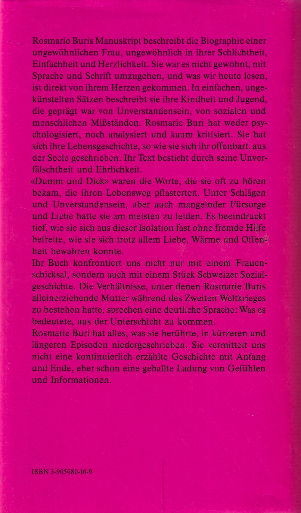 Rosmarie Buris Manuskript beschreibt die Biographie einer ungewöhnlichen Frau, ungewöhnlich in ihrer Schlichtheit, Einfachheit und Herzlichkeit. Sie war es nicht gewohnt, mit Sprache und Schrift umzugehen, und was wir heute lesen, ist direkt von ihrem Herzen gekommen. In einfachen, ungekünstelten Sätzen beschreibt sie ihre Kindheit und Jugend, die geprägt war von Unverstandensein, von sozialen und menschlichen Missständen. Rosmarie Buri hat weder psychologisiert, noch analysiert und kaum kritisiert. Sie hat sich ihre Lebensgeschichte, so wie sie sich ihr offenbart, aus der Seele geschrieben. Ihr Text besticht durch seine Unverfälschtheit und Ehrlichkeit.