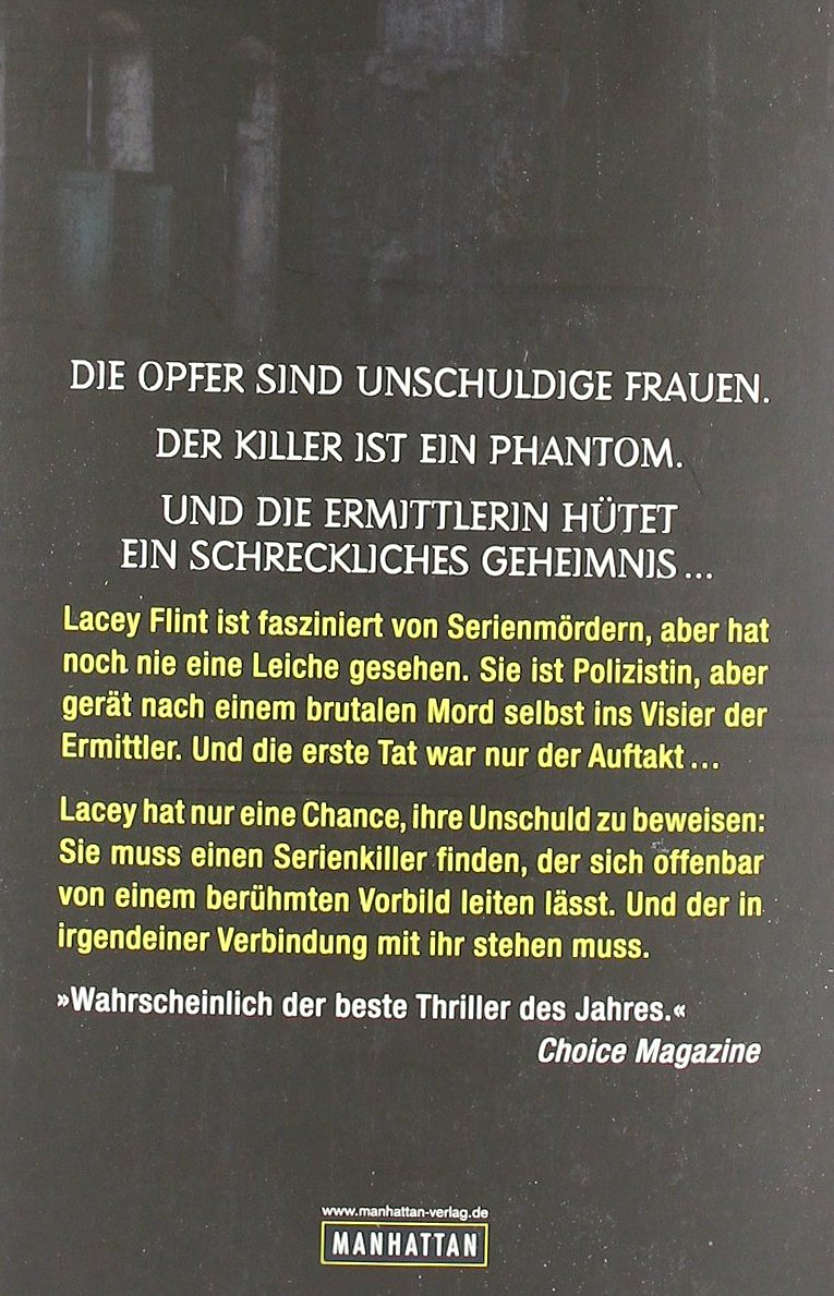 DC Lacey Flint ist eine junge Londoner Ermittlerin mit undurchsichtiger Vergangenheit und einem morbiden Interesse an Serienkillern. Mit einem echten Mord hatte sie bisher allerdings nie zu tun bis jetzt, da eine aus zahlreichen Stichwunden blutende Frau an der Tür von Laceys Wagen lehnt und in ihren Armen stirbt. Lacey wird zunächst nur als Zeugin vernommen, doch bald wird klar, dass sie in dem Fall eine ganz besondere Rolle spielt: Ein blutiger Bekennerbrief ist unmissverständlich an sie adressiert. Unversehens findet sich Lacey im Mittelpunkt einer Mordserie, die in einem besonderen Zusammenhang mit ihr selbst stehen muss. Doch wie findet man einen Killer, der sich einen nie gefassten Serienmörder zum Vorbild genommen hat?