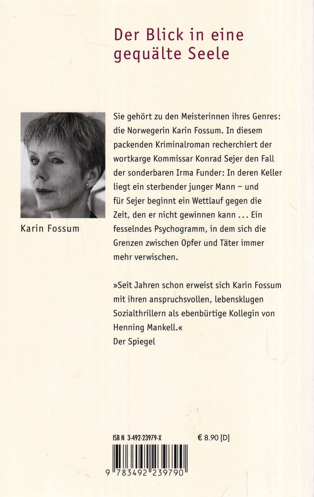 Sie gehört zu den Meisterinnen ihres Genres: die Norwegerin Karin Fossum. In diesem packenden Kriminalroman recherchiert der wortkarge Kommissar Konrad Sejer den Fall der sonderbaren Irma Funder: In deren Keller liegt ein sterbender junger Mann - und für Sejer beginnt ein Wettlauf gegen die Zeit, den er nicht gewinnen kann ... Ein fesselndes Psychogramm, in dem sich der Unterschied zwischen Opfer und Täter immer mehr verwischt.