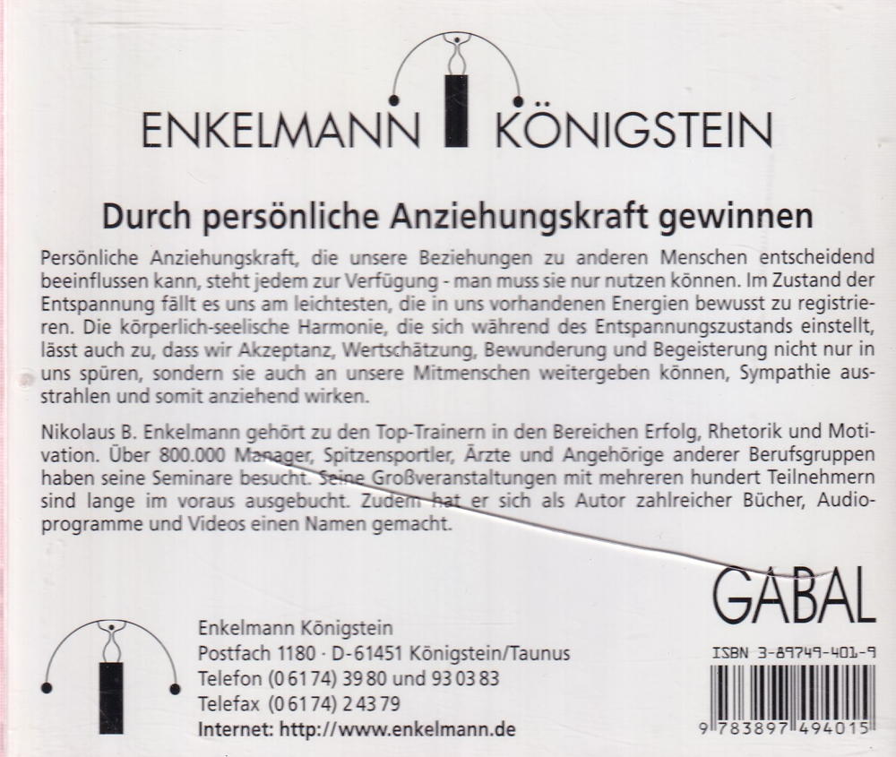 Persönliche Anziehungskraft, die unsere Beziehungen zu anderen Menschen entscheidend beeinflussen kann, steht jedem zur Verfügung - man muss sie nur nutzen kõnnen. Im Zustand der Entspannung fällt es uns am leichtesten, die in uns vorhandenen Energien bewusst zu registrieren. Die kõrperlich-seelische Harmonie, die sich wāhrend des Entspannungszustands einstellt, lässt auch zu, dass wir Akzeptanz, Wertschätzung, Bewunderung und Begeisterung nicht nur in uns spūren, sondern sie auch an unsere Mitmenschen weitergeben kõnnen, Sympathie ausstrahlen und somit anziehend wirken.
