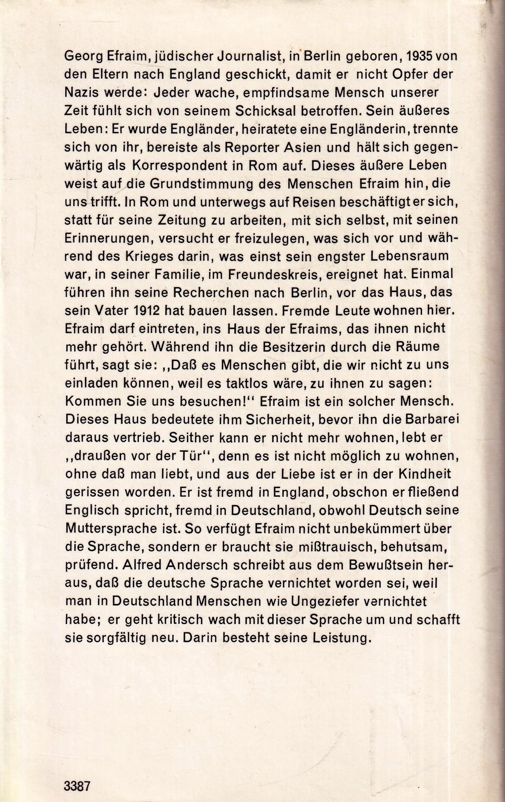 Dieses Haus bedeutete ihm Sicherheit, bevor ihn die Barbarei daraus vertrieb. Seither kann er nicht mehr wohnen, lebt er „draussen vor der Tür", denn es ist nicht möglich zu wohnen, ohne dass man liebt, und aus der Liebe ist er in der Kindheit gerissen worden. Er ist fremd in England, obschon er fliessend Englisch spricht, fremd in Deutschland, obwohl Deutsch seine Muttersprache ist. So verfügt Efraim nicht unbekümmert über die Sprache, sondern er braucht sie misstrauisch, behutsam, prüfend. Alfred Andersch schreibt aus dem Bewusstsein heraus, dass die deutsche Sprache vernichtet worden sei, weil man in Deutschland Menschen wie Ungeziefer vernichtet habe; er geht kritisch wach mit dieser Sprache um und schafft sie sorgfältig neu. Darin besteht seine Leistung.