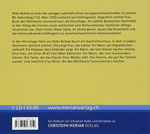 Peter Bichsel ist einer der wenigen wahrhaft echten Kurzgeschichtenschreiber. Zu seinem 80. Geburtstag (*23. März 1935) erscheint sein Erstlingswerk «Eigentlich möchte Frau Blum den Milchmann kennenlernen» als Hörcollage. Als subtiler Beobachter beschreibt er den Alltag der kleinen Leute und breitet eine Reihe scheinbar idyllischer Alltagssituationen aus. Doch hinter dieser Idylle, im Verborgenen, lauern die Einsamkeit und die immerwährende Unfähigkeit zur zwischenmenschlichen Kommunikation.