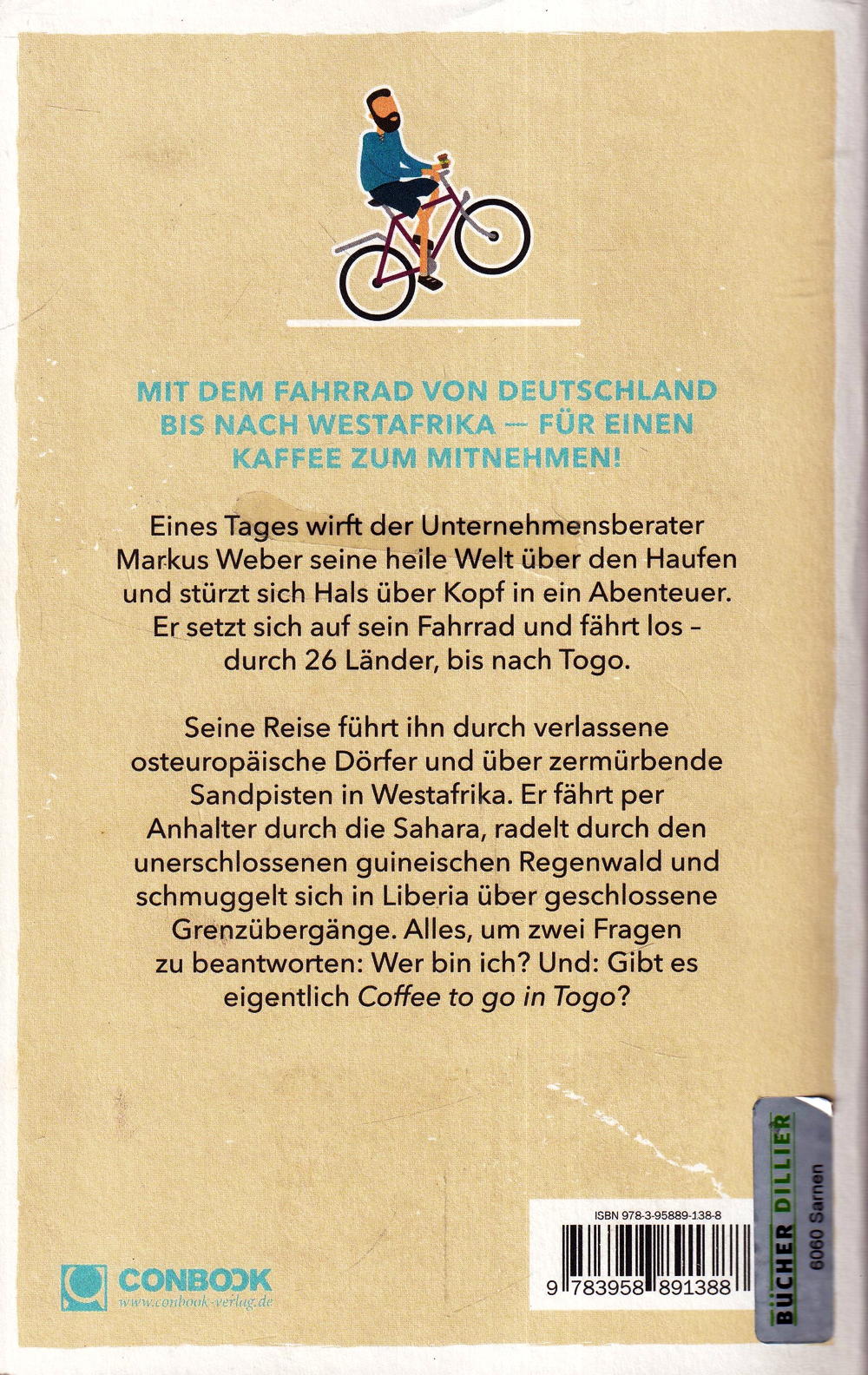 Ein Fahrrad, 26 Länder und jede Menge Kaffee Eines Tages wirft der Unternehmensberater Markus Weber seine heile Welt über den Haufen und stürzt sich Hals über Kopf in ein Abenteuer. Er setzt sich auf sein Fahrrad und fährt los – durch 26 Länder, bis nach Togo. Seine Reise führt ihn durch verlassene osteuropäische Dörfer und über zermürbende Sandpisten in Westafrika. Er fährt per Anhalter durch die Sahara, radelt durch den guineischen Regenwald und schmuggelt sich in Liberia über geschlossene Grenzübergänge. Alles, um zwei Fragen zu beantworten: Wer bin ich? Und: Gibt es eigentlich Coffee to go in Togo?