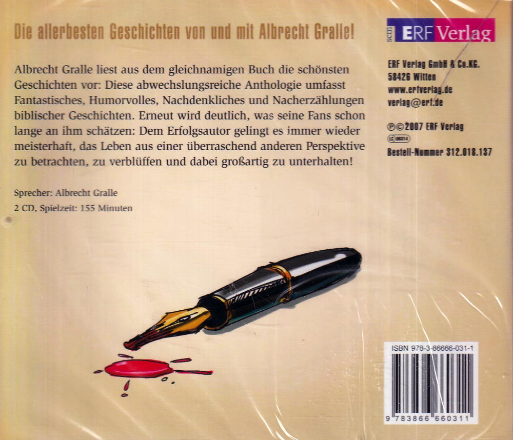 Albrecht Gralle liest aus dem gleichnamigen Buch die schönsten Geschichten vor: Diese abwechslungsreiche Anthologie umfasst Fantastisches, Humorvolles, Nachdenkliches und Nacherzählungen biblischer Geschichten. Erneut wird deutlich, was seine Fans schon lange an ihm schätzen: Dem Erfolgsautor gelingt es immer wieder meisterhaft, das Leben aus einer überraschend anderen Perspektive zu betrachten, zu verblüffen und dabei großartig zu unterhalten!