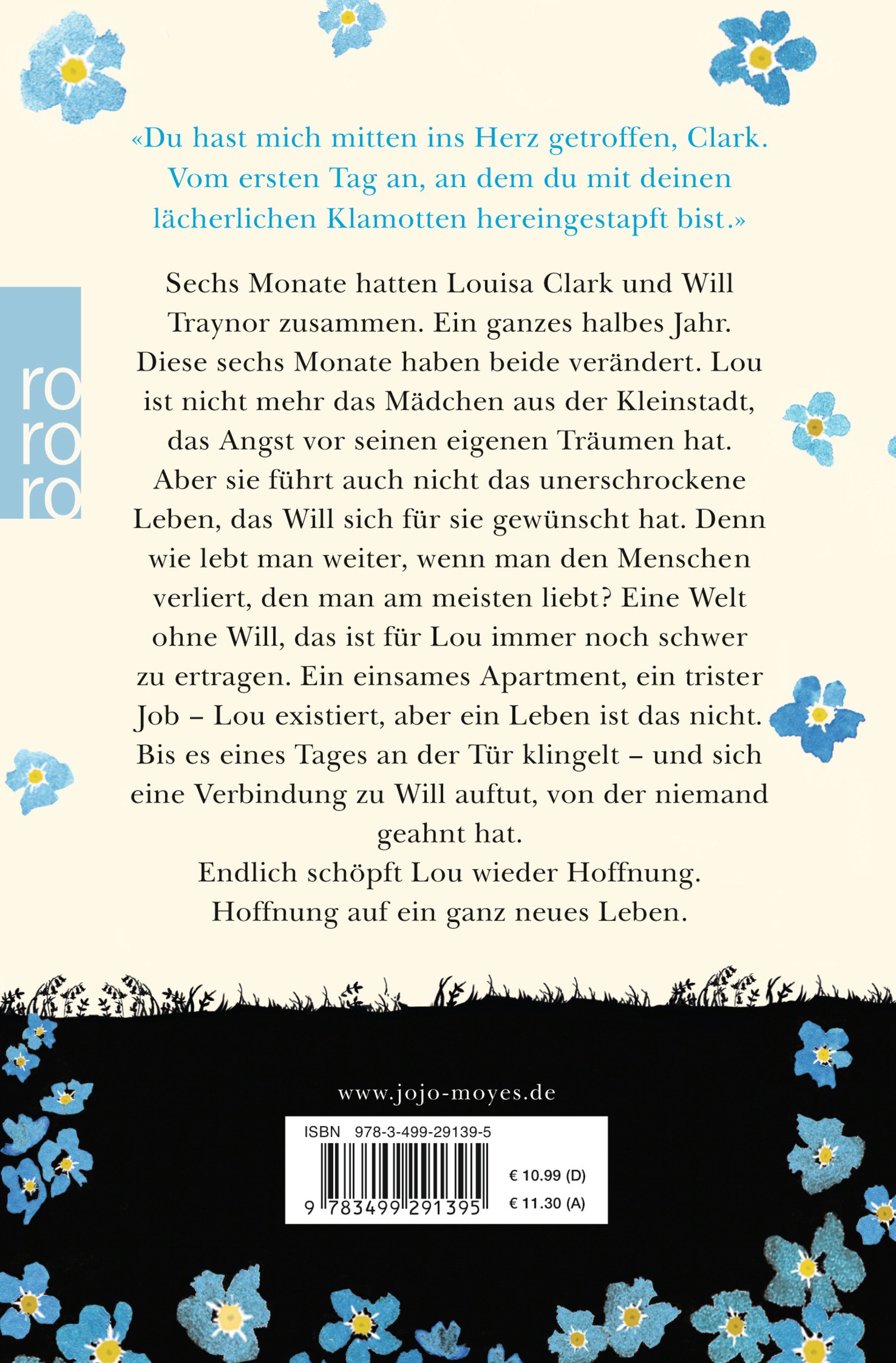 Sechs Monate hatten Louisa Clark und Will Traynor zusammen. Ein ganzes halbes Jahr. Und diese sechs Monate haben beide verändert. Lou ist nicht mehr das Mädchen aus der Kleinstadt, das Angst vor seinen eigenen Träumen hat. Aber sie führt auch nicht das unerschrockene Leben, das Will sich für sie gewünscht hat. Denn wie lebt man weiter, wenn man den Menschen verliert, den man am meisten liebt? Eine Welt ohne Will, das ist für Lou immer noch schwer zu ertragen. Ein einsames Apartment, ein trister Job am Flughafen - Lou existiert, aber ein Leben ist das nicht. Bis es eines Tages an der Tür klingelt - und sich eine Verbindung zu Will auftut, von der niemand geahnt hat. Endlich schöpft Lou wieder Hoffnung. Hoffnung auf ein ganz neues Leben.