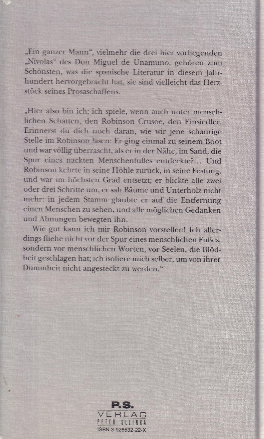 „Ein ganzer Mann“, vielmehr die drei hier vorliegenden „Nivolas“des Don Miguel de Unamuno, gehören zum Schönsten, was die spanische Literatur in diesem Jahrhundert hervorgebracht hat, sie sind vielleicht das Herzstück seines Prosaschaffens.