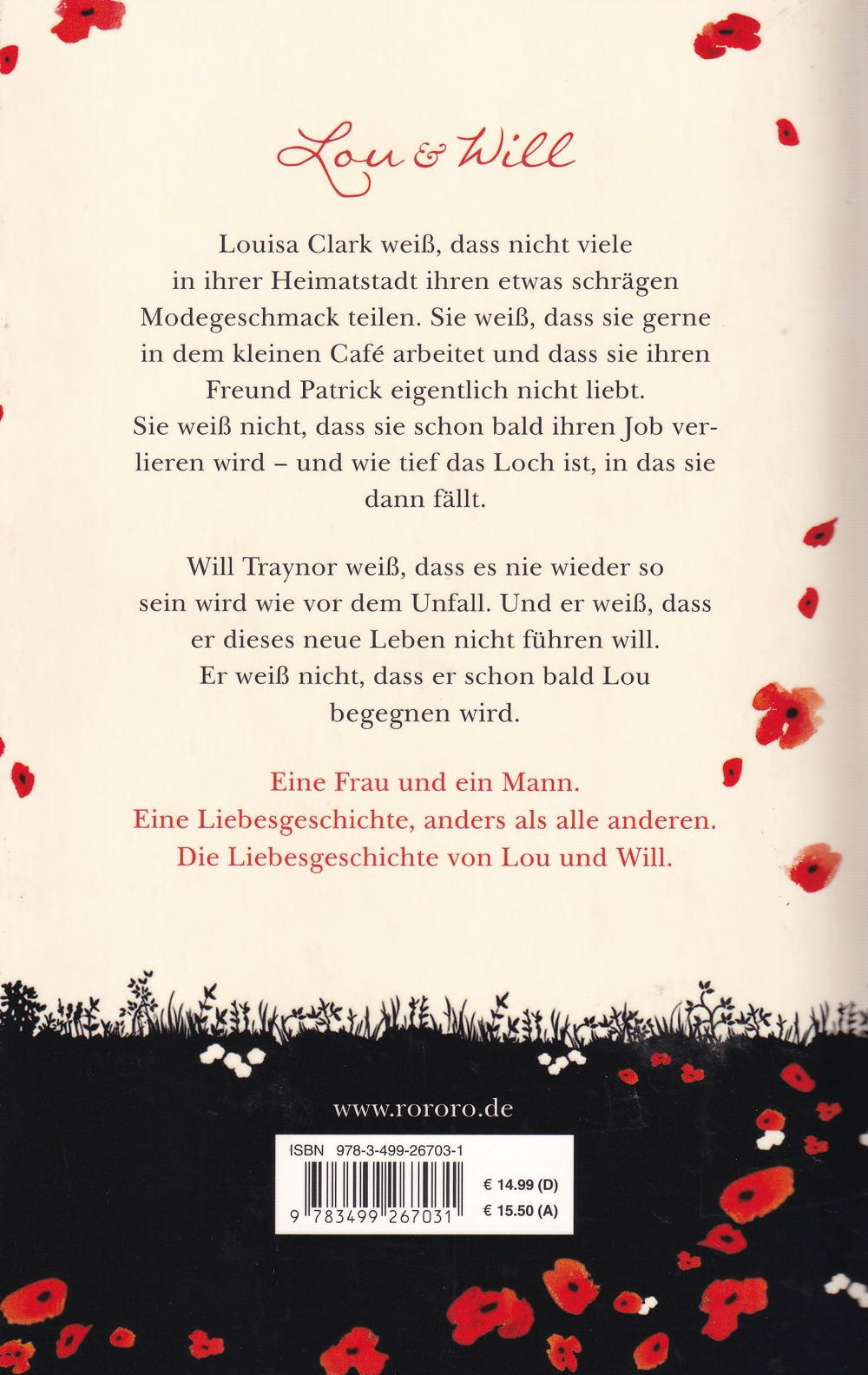 Louisa Clark weiss, dass nicht viele in ihrer Heimatstadt ihren etwas schrägen Modegeschmack teilen. Sie weiss, dass sie gerne in dem kleinen Café arbeitet und dass sie ihren Freund Patrick eigentlich nicht liebt.