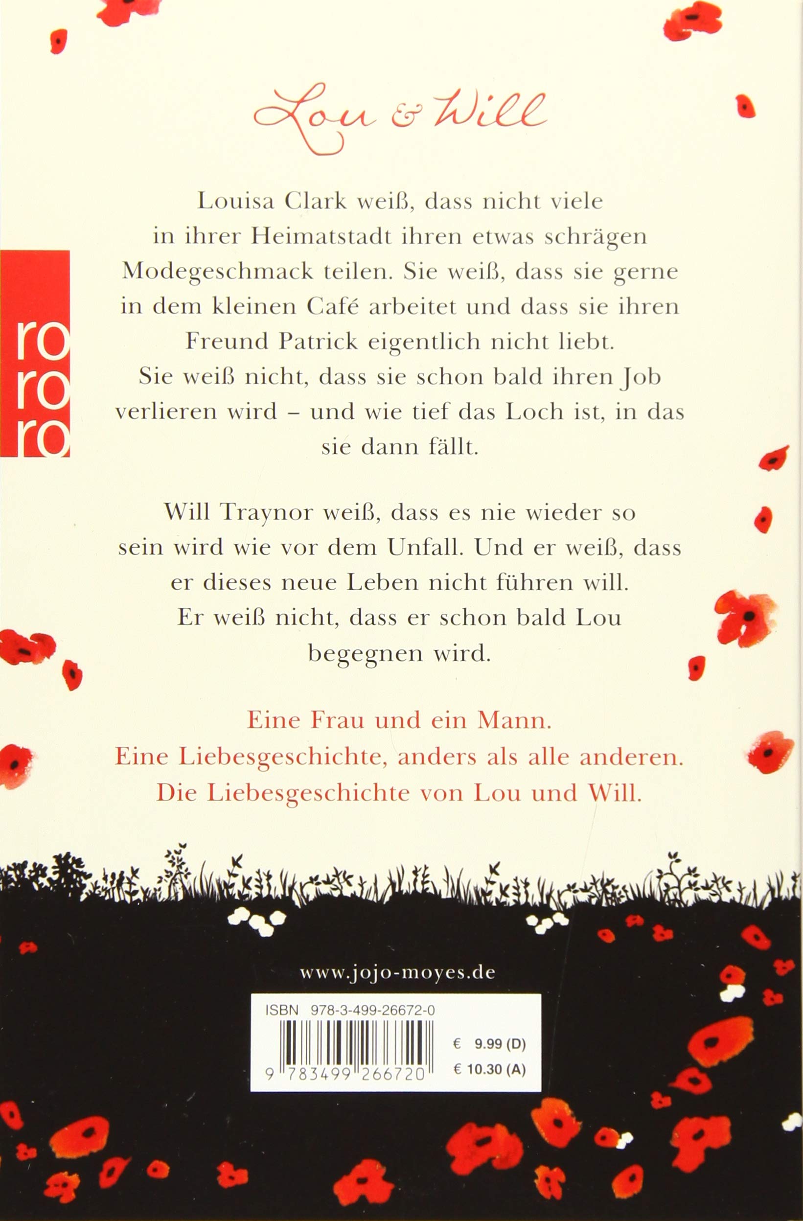 Louisa Clark weiss, dass nicht viele in ihrer Heimatstadt ihren etwas schrägen Modegeschmack teilen. Sie weiss, dass sie gerne in dem kleinen Café arbeitet und dass sie ihren Freund Patrick eigentlich nicht liebt. Sie weiss nicht, dass sie schon bald ihren Job verlieren wird - und wie tief das Loch ist, in das sie dann fällt.