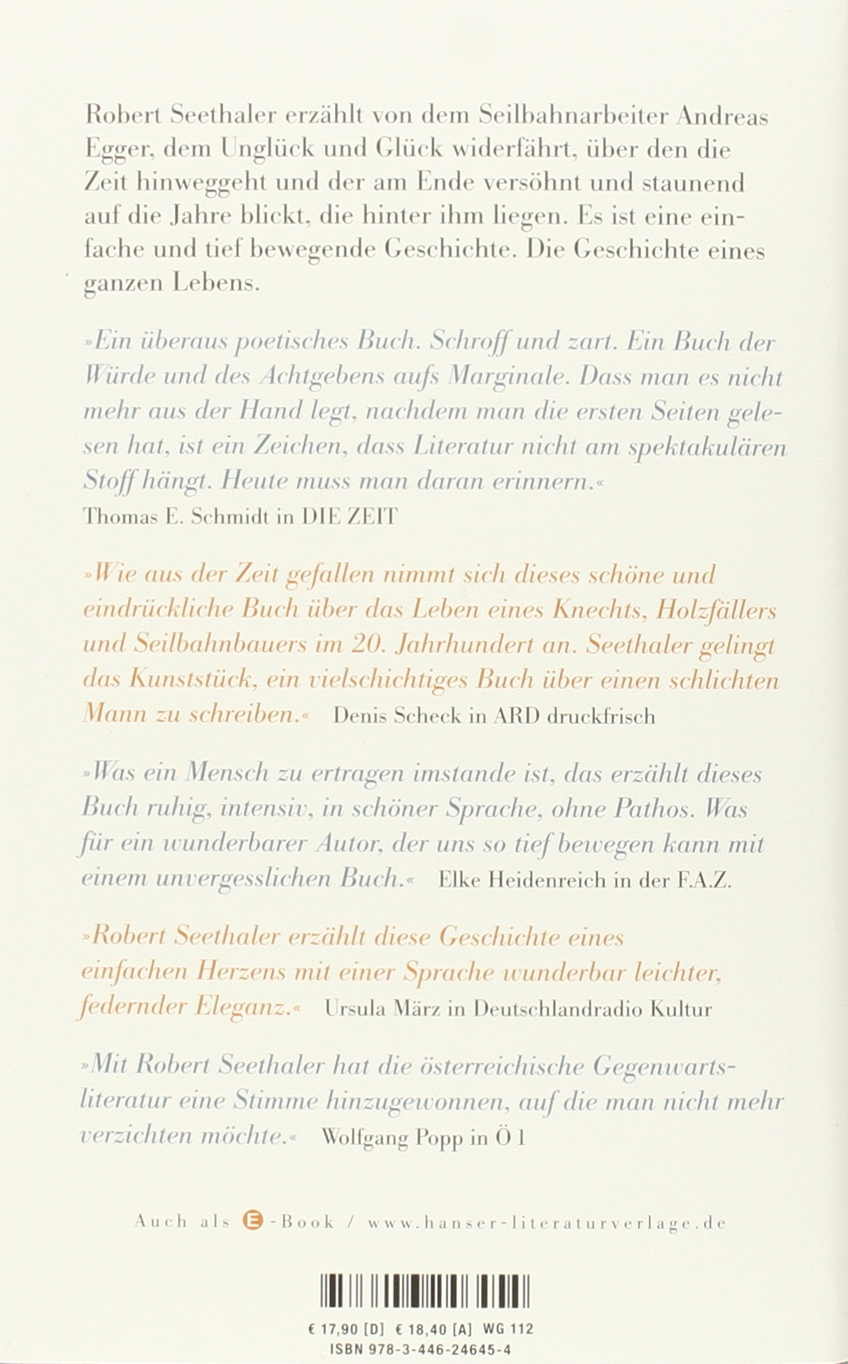 Als Andreas Egger in das Tal kommt, in dem er sein Leben verbringen wird, ist er vier Jahre alt, ungefähr - so genau weiß das keiner. Er wächst zu einem gestandenen Hilfsknecht heran und schließt sich als junger Mann einem Arbeitstrupp an, der eine der ersten Bergbahnen baut und mit der Elektrizität auch das Licht und den Lärm in das Tal bringt. Dann kommt der Tag, an dem Egger zum ersten Mal vor Marie steht, der Liebe seines Lebens, die er jedoch wieder verlieren wird. Erst viele Jahre später, als Egger seinen letzten Weg antritt, ist sie noch einmal bei ihm. Und er, über den die Zeit längst hinweggegangen ist, blickt mit Staunen auf die Jahre, die hinter ihm liegen. Eine einfache und tief bewegende Geschichte.