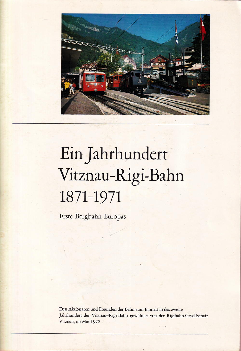 Erste Bergbahn Europas Den Aktionären und Freunden der Bahn zum Eintritt in das zweite Jahrhundert der Vitznau–Rigi-Bahn gewidmet von der Rigibahn-Gesellschaft Vitznau, im Mai 1972