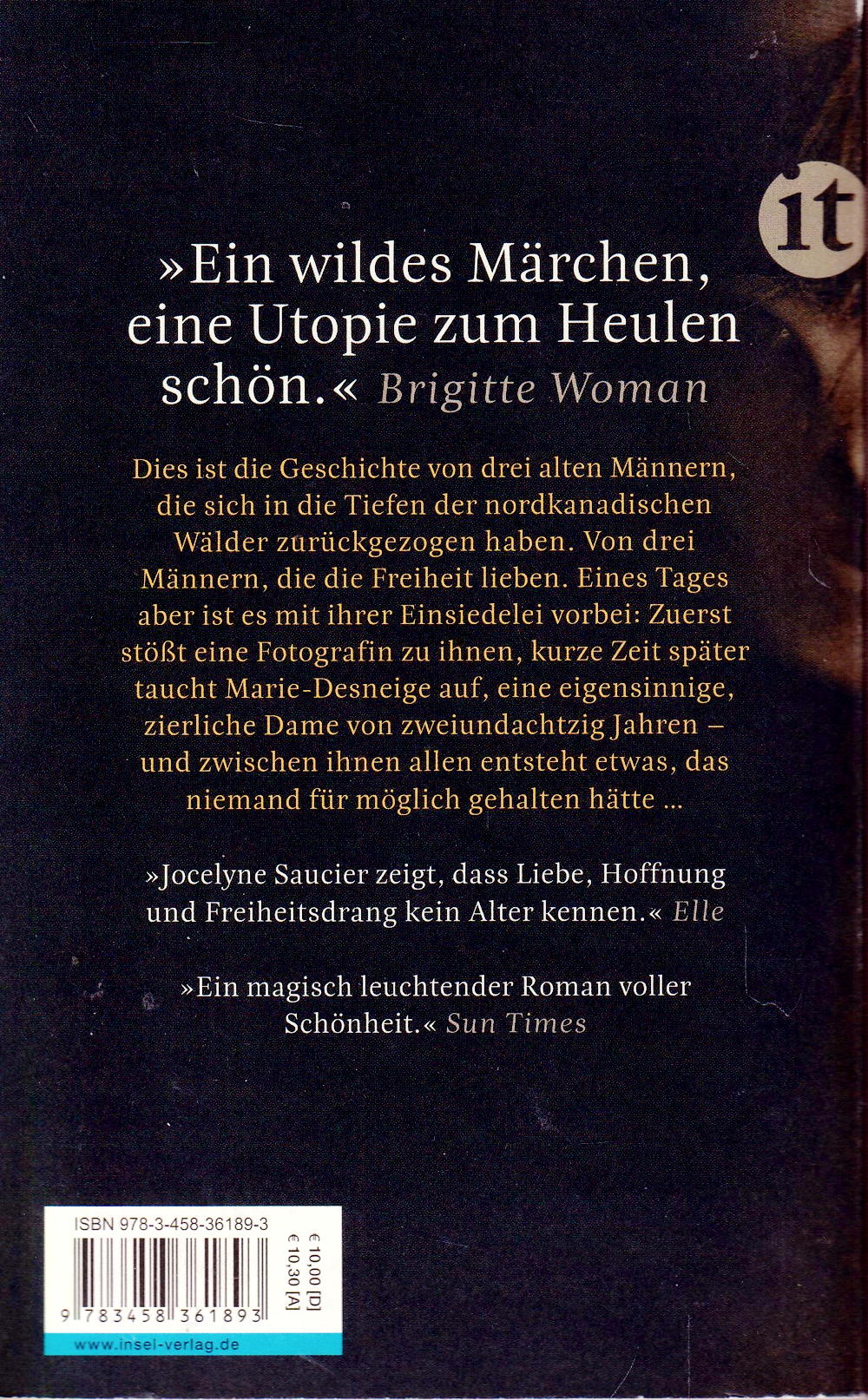 Dies ist die Geschichte von drei alten Männern, die sich in die nordkanadischen Wälder zurückgezogen haben. Von drei Männern, die die Freiheit lieben. Eines Tages aber ist es mit ihrer Einsiedelei vorbei. Zuerst stösst eine Fotografin zu ihnen, sie sucht nach einem der letzten Überlebenden der Grossen Brände, einem gewissen Boychuck. Kurze Zeit später taucht Marie-Desneiges auf, eine eigensinnige, zierliche Dame von achtzig Jahren. Die Frauen bleiben. Und während sie dem Rätsel um Boychucks Überleben nachgehen, entsteht etwas unter diesen Menschen, das niemand für möglich gehalten hätte.