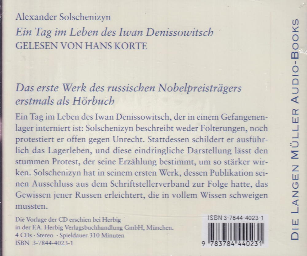 Ein Tag im Leben des Iwan Denissowitsch, der in einem Gefangenenlager interniert ist: Solschenizyn beschreibt weder Folterungen, noch protestiert er offen gegen Unrecht. Stattdessen schildert er ausführlich das Lagerleben, und diese eindringliche Darstellung lässt den stummen Protest, der seine Erzählung bestimmt, um so stärker wirken. Solschenizyn hat in seinem ersten Werk, dessen Publikation seinen Ausschluss aus dem Schriftstellerverband zur Folge hatte, das Gewissen jener Russen erleichtert, die in vollem Wissen schweigen mussten.