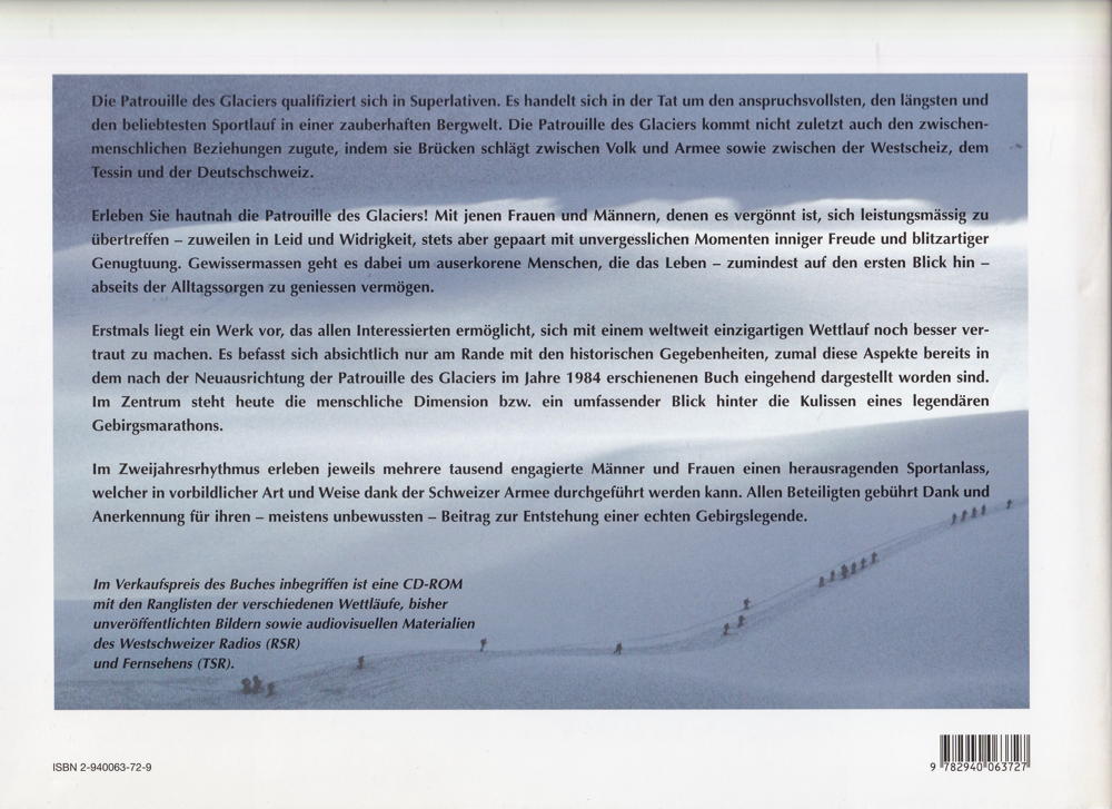 Erstmals liegt ein Werk vor, das allen Interessierten ermöglicht, sich mit einem weltweit einzigartigen Wettlauf noch besser vertraut zu machen. Es befasst sich absichtlich nur am Rande mit den historischen Gegebenheiten, zumal diese Aspekte bereits in dem nach der Neuausrichtung der Patrouille des Glaciers im Jahre 1984 erschienenen Buch eingehend dargestellt worden sind.