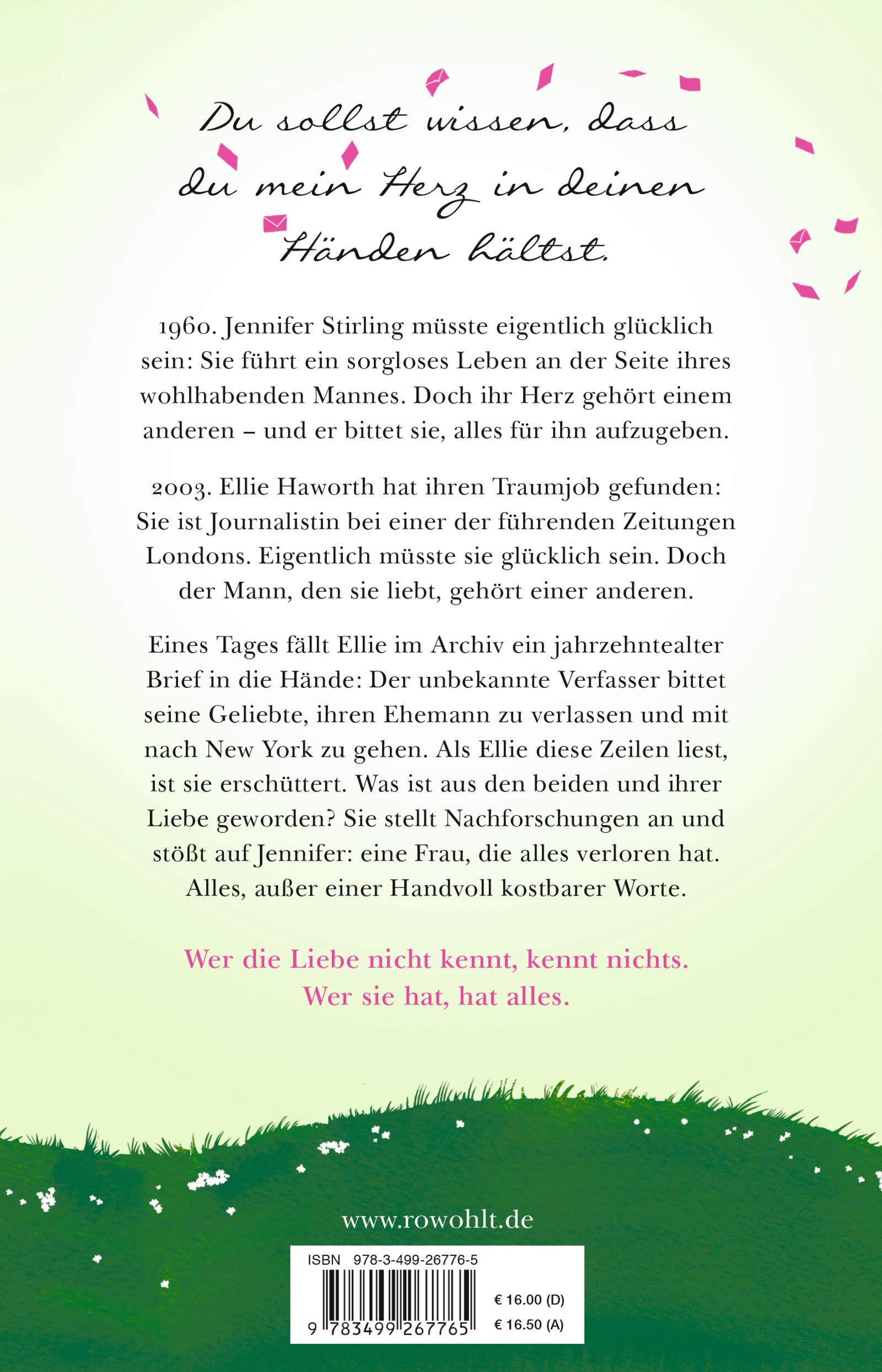 Eines Tages fällt Ellie im Archiv ein Jahrzehnte alter Brief in die Hände: Der unbekannte Absender bittet seine Geliebte, ihren Ehemann zu verlassen und mit ihm nach New York zu gehen. Als Ellie diese Zeilen liest, ist sie erschüttert. Was ist aus den beiden und ihrer Liebe geworden? Sie stellt Nachforschungen an und stösst auf Jennifer: eine Frau, die alles verloren hat. Alles, ausser einer Handvoll kostbarer Worte.