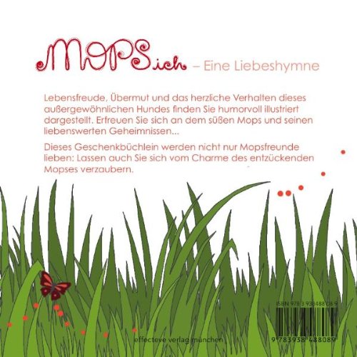 MOPS ich. Eine Liebeshymne ist ein Geschenkbuch für Mopsbesitzer und Mopsliebhaber: herzig illustrierte Sequenzen aus dem Alltagsleben des Mopses. Der Schenkende findet in dem Buch zudem die Möglichkeit für eine persönliche Widmung. Der Mops ist einzigartig! Typische Mops-Eigenschaften werden humorvoll aufgezeigt, dem Leser wird ebenso ein kurzer Einblick in die Herkunftsgeschichte des Mopses gewährt.