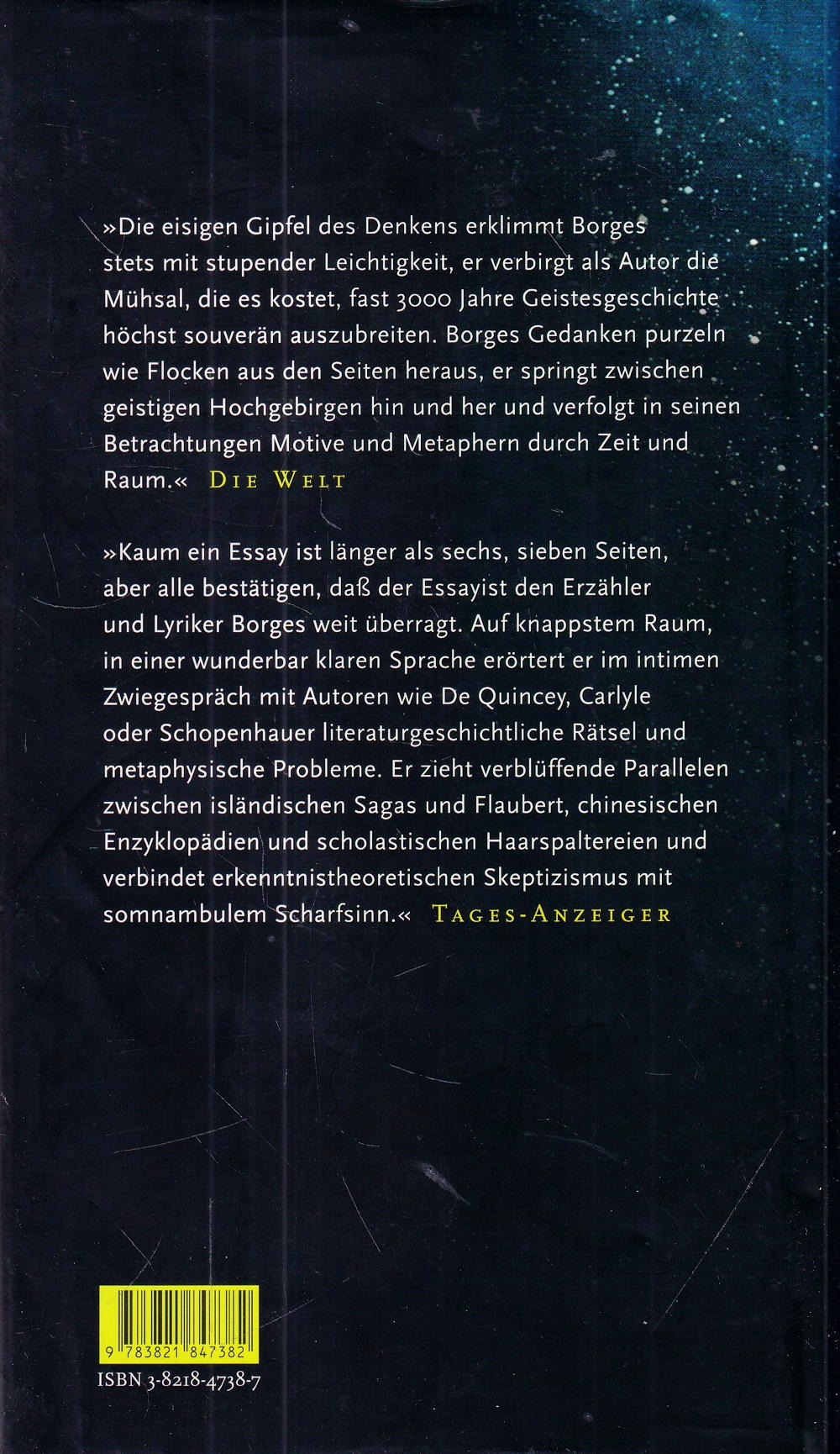 Die Erzählungen! Immer wieder die selben, vielzitierten Erzählungen. Borges kann nicht erzählen, ohne zu denken, und nicht denken, ohne zu erzählen. Deshalb sind seine Essays nicht weniger phantastisch, radikal und "fabelhaft" als seine Ficciones - ja, vielleicht steckt in ihnen sogar der eigentliche Kern seiner Autorschaft. Sonderbar, dass sie in keiner handlichen Ausgabe auf dem Markt zu finden sind. Viele von ihnen nennen sich "Historien", "Träume" oder "Rätsel", und alle sprengen den hergebrachten Begriff des Essays und verleihen der Gattung einen neuen, irisierenden Glanz. Die frühesten unter diesen Stücken, kaum bekannt, sind achtzig Jahre alt, und sie wirken so frisch und überraschend wie am ersten Tag. Die Themen sind so vielfältig, dass man sich an den Kopf greift. Von der "Kunst des Schmähens" handeln sie, von der "Dauer der Hölle", von Kabbalisten und Schildkröten, Denkmaschinen und Engeln. Bishe r unbekannt war hierzulande, was Borges über die Deutschen, die Juden und den Zweiten Weltkrieg schrieb. Diese Texte widerlegen die schwarze Legende, derzufolge man es mit einem unpolitischen oder gar "rechten" Schriftsteller zu tun hat. Es ist kein Zufall, dass Borges sich so gerne mit "Rechtfertigungen" und "Widerlegungen" befasst hat. Den Zeitgeist hat er stets verachtet, und zum Mainstream wird er nie gehören.