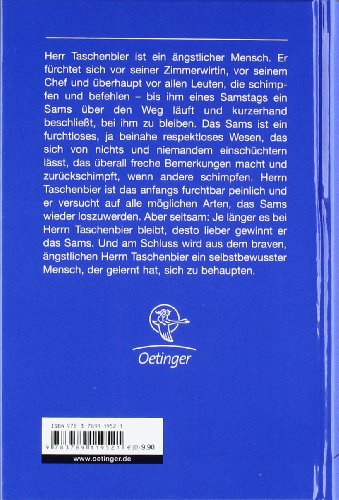 Herr Taschenbier ist ein ängstlicher Mensch. Er fürchtet sich vor seiner Zimmerwirtin, vor seinem Chef und überhaupt vor allen Leuten, die schimpfen und befehlen - bis ihm eines Samstags ein Sams über den Weg läuft und kurzerhand beschliesst, bei ihm zu bleiben. Das Sams ist ein furchtloses, ja beinahe respektloses Wesen, das sich von nichts und niemandem einschüchtern lässt, das überall freche Bemerkungen macht und zurückschimpft, wenn andere schimpfen. Herrn Taschenbier ist das anfangs furchtbar peinlich und er versucht auf alle möglichen Arten, das Sams wieder loszuwerden.Aber seltsam: Je länger es bei Herrn Taschenbier bleibt, desto lieber gewinnt er das Sams. Und am Schluss wird aus dem braven, ängstlichen Herrn Taschenbier ein selbstbewusster Mensch, der gelernt hat, sich zu behaupten.
