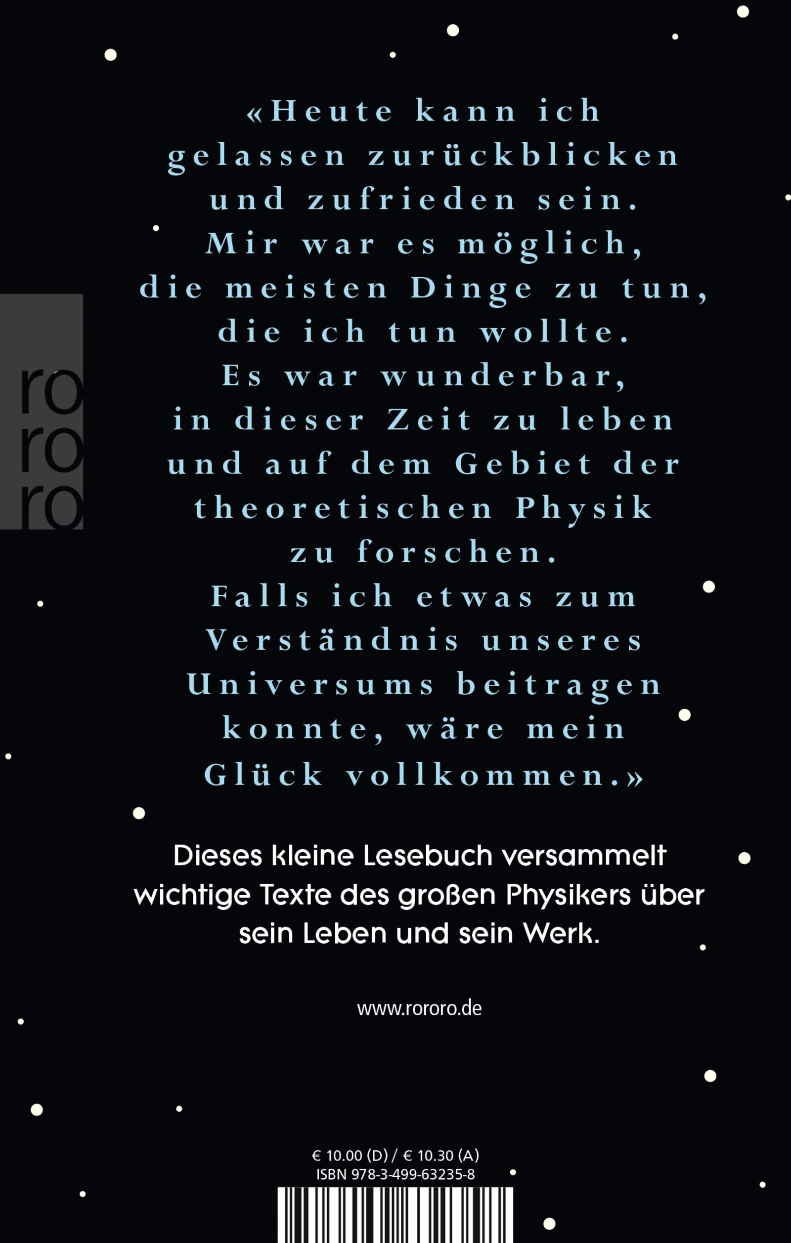 Stephen Hawking ist der berühmteste Wissenschaftler unserer Zeit. Ein Meister der eleganten Vereinfachung, der Mann, der Astrophysik und Kosmologie weltweit populär gemacht hat. Dieses kleine Lesebuch, zusammengestellt aus Anlass des 75. Geburtstages, präsentiert in Selbstzeugnissen den privaten Stephen Hawking — Kindheit, Studium, Karrierebeginn und das Leben mit ALS – und sein wissenschaftliches Credo in ausgewählten Texten. Es ist für alle gedacht, die sich wichtige Stationen in Leben und Werk des grossen Physikers noch einmal vor Augen führen oder anhand von einigen seiner Texte Zugang finden möchten zu Stephen Hawkings Universum.