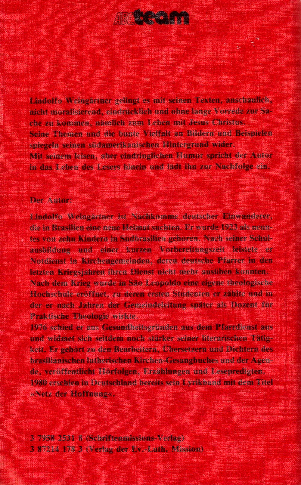 Lindolfo Weingärtner gelingt es mit seinen Texten, anschaulich, nicht moralisierend, eindrücklich und ohne lange Vorrede zur Sache zu kommen, nämlich zum Leben mit Jesus Christus.