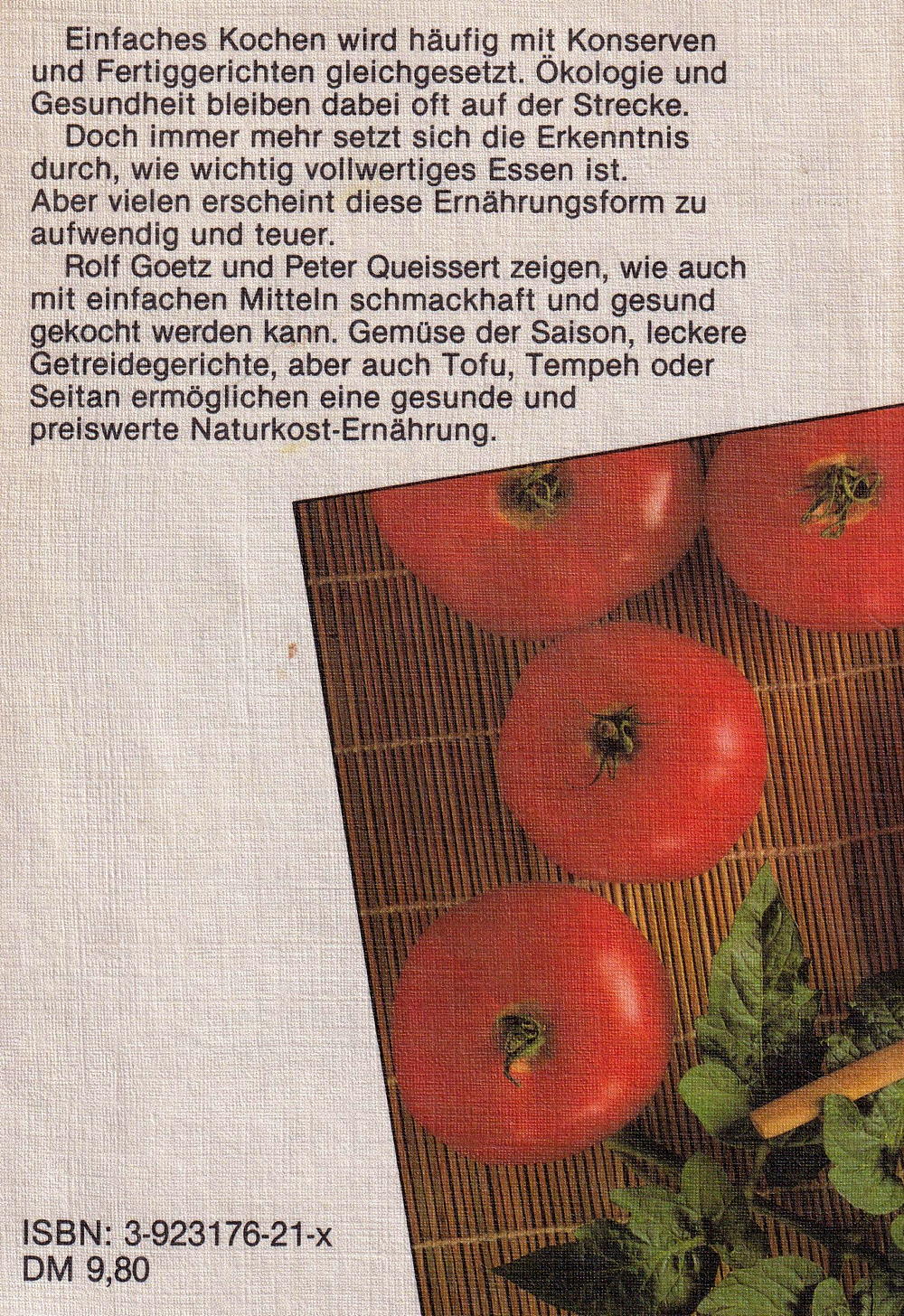 Rolf Goetz und Peter Queissert zeigen, wie auch mit einfachen Mitteln schmackhaft und gesund gekocht werden kann. Gemüse der Saison, leckere Getreidegerichte, aber auch Tofu, Tempeh oder Seitan ermöglichen eine gesunde und preiswerte Naturkost-Ernährung.