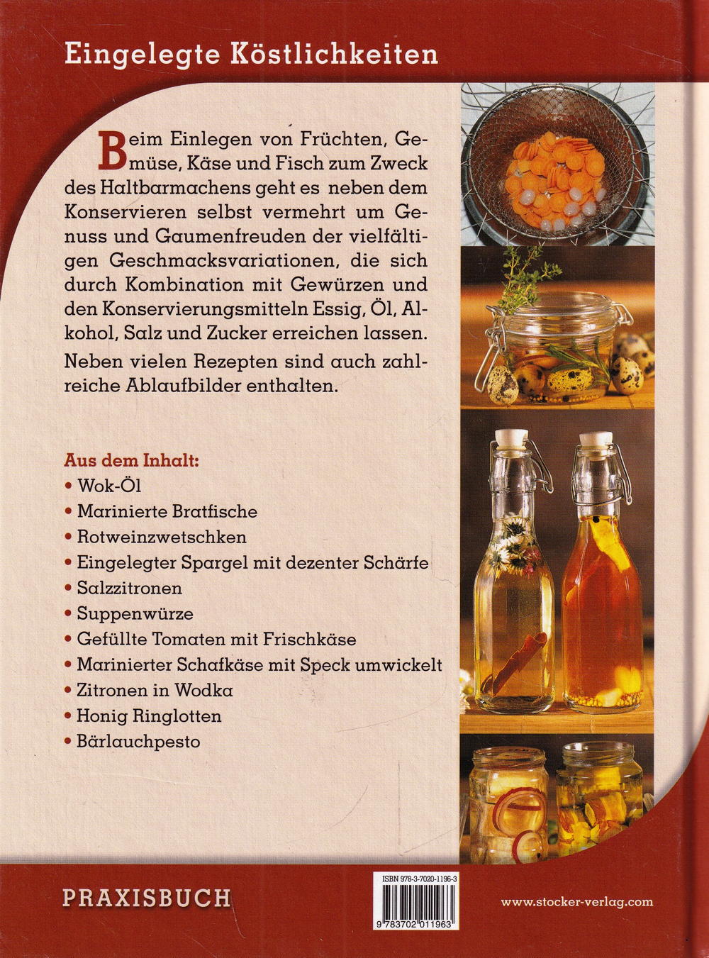 Das Einlegen von Früchten, Gemüse, Käse und Fisch zum Zwecke des Haltbarmachens hat lange Tradition. Hier geht es aber weniger um das Konservieren selbst als vielmehr um die vielfältigen Geschmacksvariationen, die sich durch Kombination mit Gewürzen und den Konservierungsmitteln Essig, Öl, Alkohol, Salz und Zucker erreichen lassen. 160 Rezepte.