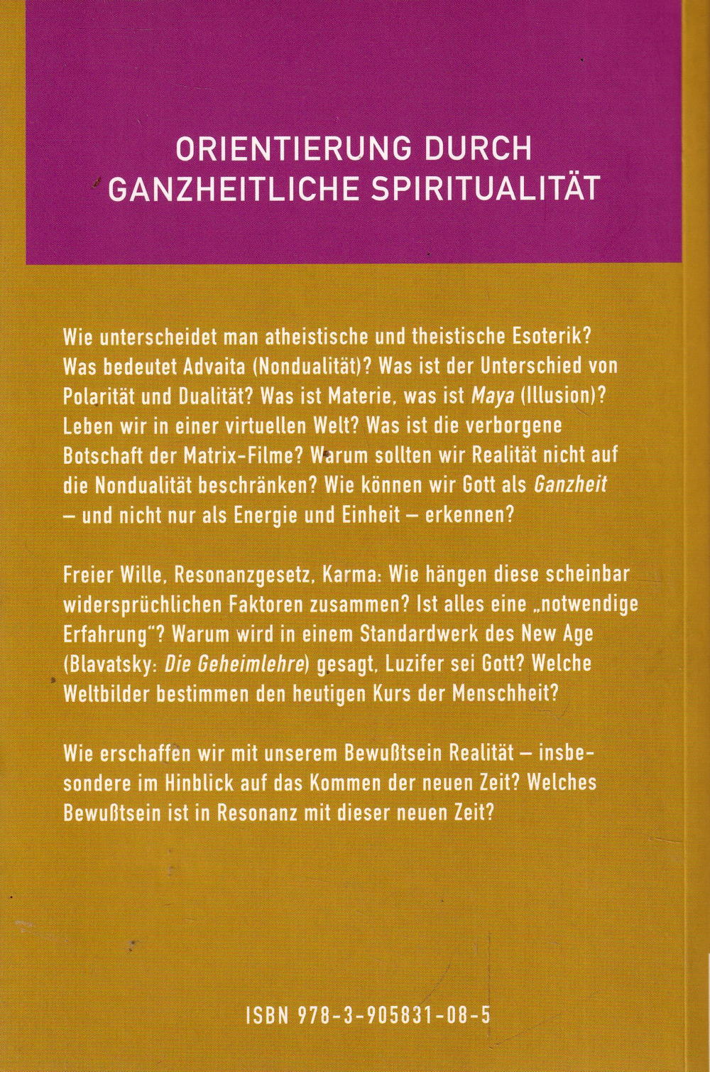 Wie unterscheidet man atheistische und theistische Esoterik? Was bedeutet Advaita (Nondualität)? Was ist der Unterschied von Polarität und Dualität? Was ist Materie, was ist Maya (Illusion)? Leben wir in einer virtuellen Welt? Was ist die verborgene Botschaft der Matrix-Filme? Warum sollten wir Realität nicht auf die Nondualität beschränken? Wie können wir Gott als Ganzheit - und nicht nur als Energie und Einheit - erkennen?