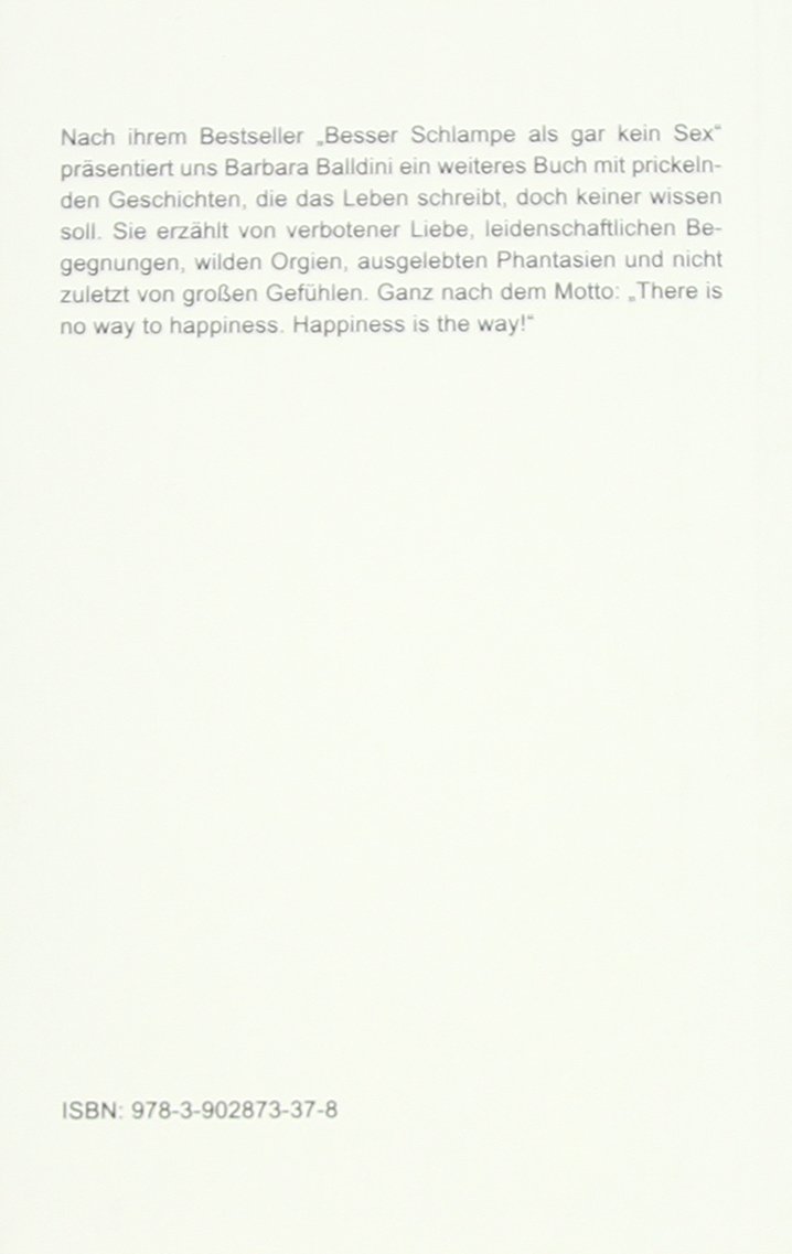 Nach ihrem Bestseller "Besser Schlampe als gar kein Sex" präsentiert uns Barbara Balldini ein weiteres Buch mit prickelnden Geschichten, die das Leben schreibt, doch keiner wissen soll. Sie erzählt von verbotener Liebe, leidenschaftlichen Begegnungen, wilden Orgien, ausgelebte Phantasien und nicht zuletzt von grossen Gefühlen. Ganz nach dem Motto: "There is no way to happiness. Happiness is the way!"