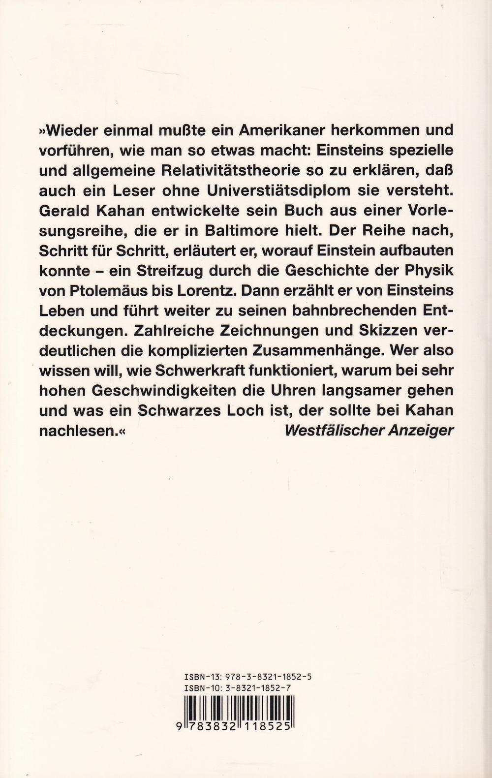 Gerald Kahan entwickelte sein Buch aus einer Vorlesungsreihe, die er in Baltimore hielt. Der Reihe nach, Schritt für Schritt, erläutert er, worauf Einstein aufbauten konnte - ein Streifzug durch die Geschichte der Physik von Ptolemäus bis Lorentz. Dann erzählt er von Einsteins Leben und führt weiter zu seinen bahnbrechenden Entdeckungen. Zahlreiche Zeichnungen und Skizzen verdeutlichen die komplizierten Zusammenhänge. Wer also wissen will, wie Schwerkraft funktioniert, warum bei sehr hohen Geschwindigkeiten die Uhren langsamer gehen und was ein Schwarzes Loch ist, der sollte bei Kahan Westfälischer Anzeiger nachlesen. «