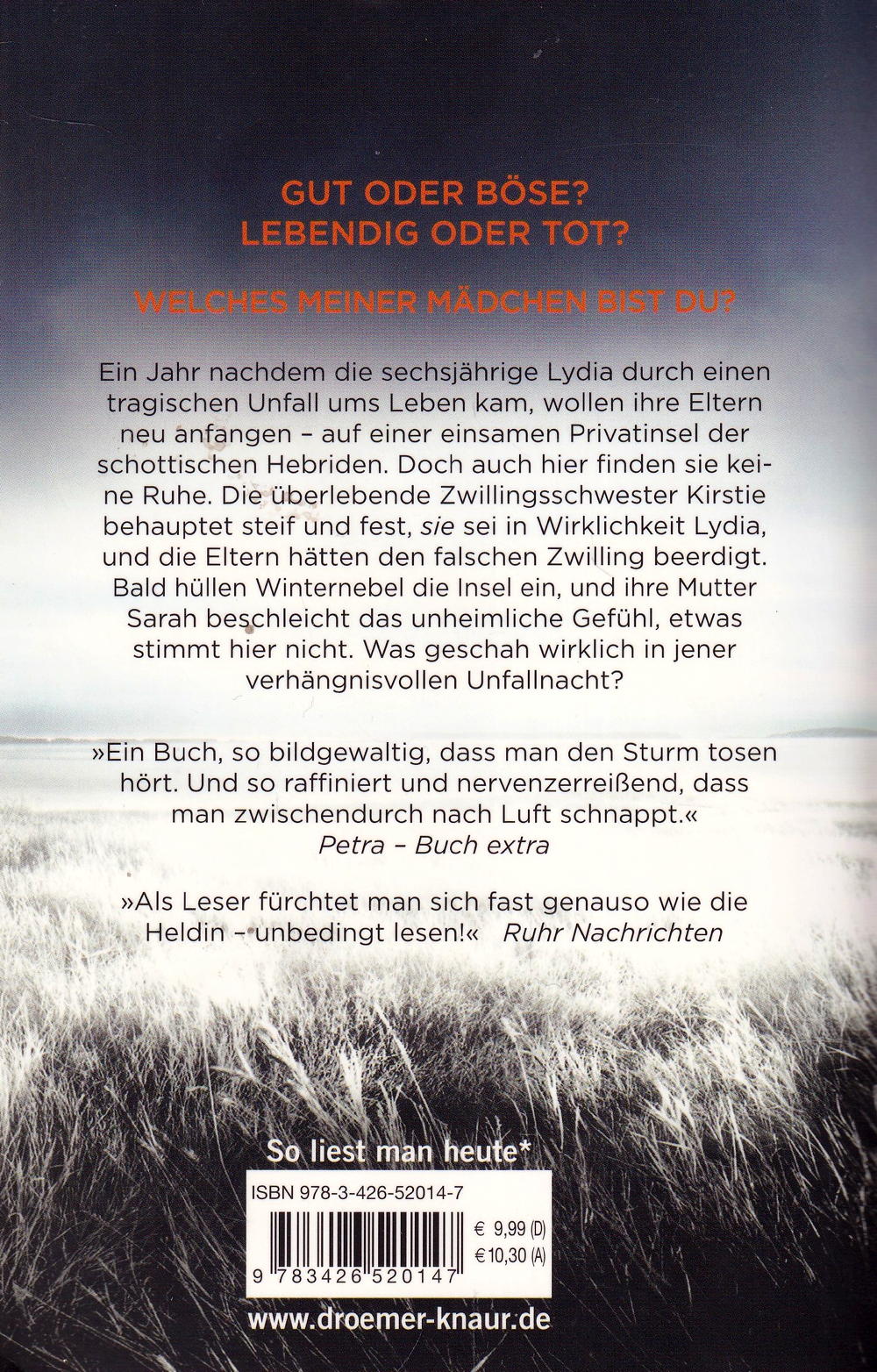 Ein Jahr nachdem die sechsjährige Lydia durch einen tragischen Unfall ums Leben kam, sind ihre Eltern Sarah und Angus psychisch am Ende. Um neu anzufangen, ziehen sie zusammen mit Lydias Zwillingsschwester Kirstie auf eine atemberaubend schöne Privatinsel der schottischen Hebriden. Doch auch hier finden sie keine Ruhe. Kirstie behauptet steif und fest, sie sei in Wirklichkeit Lydia und die Eltern hätten den falschen Zwilling beerdigt. Bald hüllen Winternebel die Insel ein, Angus ist beruflich oft abwesend, und bei Sarah schleicht sich das unheimliche Gefühl ein, etwas stimme nicht. Zunehmend fragt sie sich, welches ihrer Mädchen lebt. Als ein heftiger Sturm aufzieht, sind Sarah und Kirstie komplett isoliert und den Geistern der Vergangenheit ausgeliefert.