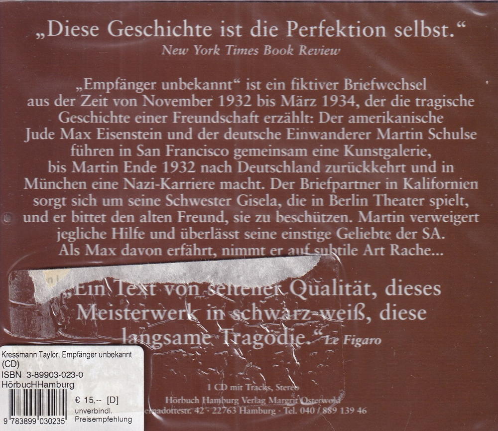„Empfänger unbekannt“ist ein fiktiver Briefwechsel aus der Zeit von November 1932 bis März 1934, der die tragische Geschichte einer Freundschaft erzählt: Der amerikanische Jude Max Eisenstein und der deutsche Einwanderer Martin Schulse führen in San Francisco gemeinsam eine Kunstgalerie, bis Martin Ende 1932 nach Deutschland zurückkehrt und in München eine Nazi-Karriere macht. Der Briefpartner in Kalifornien sorgt sich um seine Schwester Gisela, die in Berlin Theater spielt, und er bittet den alten Freund, sie zu beschützen. Martin verweigert jegliche Hilfe und überlässt seine einstige Geliebte der SA.