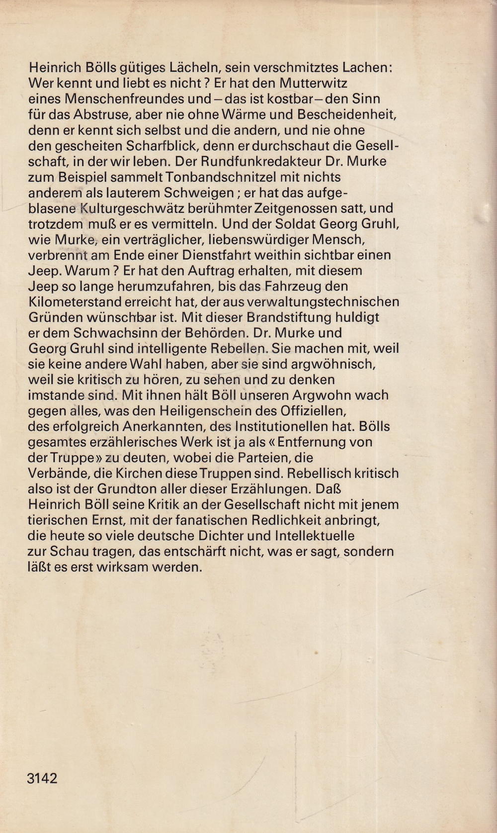 Wer kennt und liebt es nicht? Er hat den Mutterwitz eines Menschenfreundes und-das ist kostbar-den Sinn für das Abstruse, aber nie ohne Wärme und Bescheidenheit, denn er kennt sich selbst und die andern, und nie ohne den gescheiten Scharfblick, denn er durchschaut die Gesellschaft, in der wir leben. Der Rundfunkredakteur Dr. Murke zum Beispiel sammelt Tonbandschnitzel mit nichts anderem als lauterem Schweigen; er hat das aufgeblasene Kulturgeschwätz berühmter Zeitgenossen satt, und trotzdem muss er es vermitteln. Und der Soldat Georg Gruhl, wie Murke, ein verträglicher, liebenswürdiger Mensch, verbrennt am Ende einer Dienstfahrt weithin sichtbar einen Jeep. Warum? Er hat den Auftrag erhalten, mit diesem Jeep so lange herumzufahren, bis das Fahrzeug den Kilometerstand erreicht hat, der aus verwaltungstechnischen Gründen wünschbar ist. Mit dieser Brandstiftung huldigt er dem Schwachsinn der Behörden. Dr. Murke und Georg Gruhl sind intelligente Rebellen. Sie machen mit, weil sie keine andere Wahl haben, aber sie sind argwöhnisch, weil sie kritisch zu hören, zu sehen und zu denken imstande sind. Mit ihnen hält Böll unseren Argwohn wach gegen alles, was den Heiligenschein des Offiziellen, des erfolgreich Anerkannten, des Institutionellen hat. Bölls gesamtes erzählerisches Werk ist ja als « Entfernung von der Truppe» zu deuten, wobei die Parteien, die Verbände, die Kirchen diese Truppen sind. Rebellisch kritisch also ist der Grundton aller dieser Erzählungen. Dass Heinrich Böll seine Kritik an der Gesellschaft nicht mit jenem tierischen Ernst, mit der fanatischen Redlichkeit anbringt, die heute so viele deutsche Dichter und Intellektuelle zur Schau tragen, das entschärft nicht, was er sagt, sondern lässt es erst vwirksam werden.