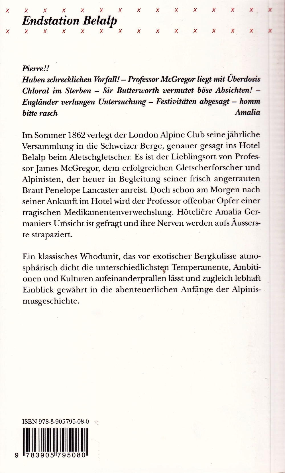 Hôtelière Amalia Germanier ist hoch erfreut, dass der London Alpine Club 1862 seine jährliche Versammlung in die Schweizer Berge verlegt, genauer gesagt in ihr Hotel Belalp beim Aletschgletscher. Es ist der Lieblingsort von Professor James McGregor, dem erfolgreichen Gletscherforscher und Alpinisten. Amalia treibt ihre Belegschaft seit Wochen zu Höchstleistungen an: Schliesslich will eine illustre Schar aus der internationalen Bergsteigergemeinde umsorgt und bewirtet sein und es sind ausgiebige Festivitäten geplant. Amalia sieht darin die Chance, ihr Hotel Belalp auf einen Schlag in der «ganzen Welt» bekannt zu machen – eine Vorstellung, die bestimmt auch ihrem Gatten Pierre gefallen würde, der derweil drunten im Tal beschäftigt ist.
