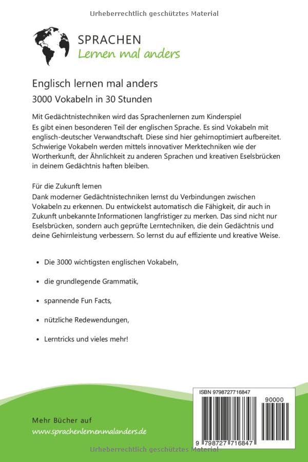 Mit den 3000 wichtigsten Wörtern alles ausdrücken, was du möchtest Die 3000 Vokabeln sind nach Häufigkeit und Aktualität ausgewählt und nach Themen geordnet. Laut einer Studie machen die 3000 häufigsten englischen Wörter über 90% der gesprochenen Sprache aus. Somit kannst du alles ausdrücken, was du möchtest. Mit Sprachen lernen mal anders wirst du in kürzester Zeit deinen Englisch-Wortschatz um 3000 Vokabeln erweitern. Ganz nebenbei erfährst du die grundlegende englische Grammatik und spannende Fun Facts über England. Zusätzlich lernst du die Lerntechniken der weltweit besten Gedächtniskünstler anhand von leicht verständlichen Beispielen. Mit Gedächtnistechniken wird das Sprachenlernen zum Kinderspiel Es gibt einen besonderen Teil der englischen Sprache. Es sind Vokabeln mit englisch-deutscher Verwandtschaft. Diese sind hier gehirnoptimiert aufbereitet. Schwierige Vokabeln werden mittels innovativer Merktechniken wie der Wortherkunft, der Ähnlichkeit zu anderen Sprachen und kreativen Eselsbrücken in deinem Gedächtnis haften bleiben. Für die Zukunft lernen Dank moderner Gedächtnistechniken lernst du Verbindungen zwischen Vokabeln zu erkennen. Du entwickelst automatisch die Fähigkeit, dir auch in Zukunft unbekannte Informationen langfristiger zu merken. Das sind nicht nur Eselsbrücken, sondern auch geprüfte Lerntechniken, die dein Gedächtnis und deine Gehirnleistung verbessern. So lernst du auf effiziente und kreative Weise. Erweitere jetzt deinen Englisch-Wortschatz spielend einfach!